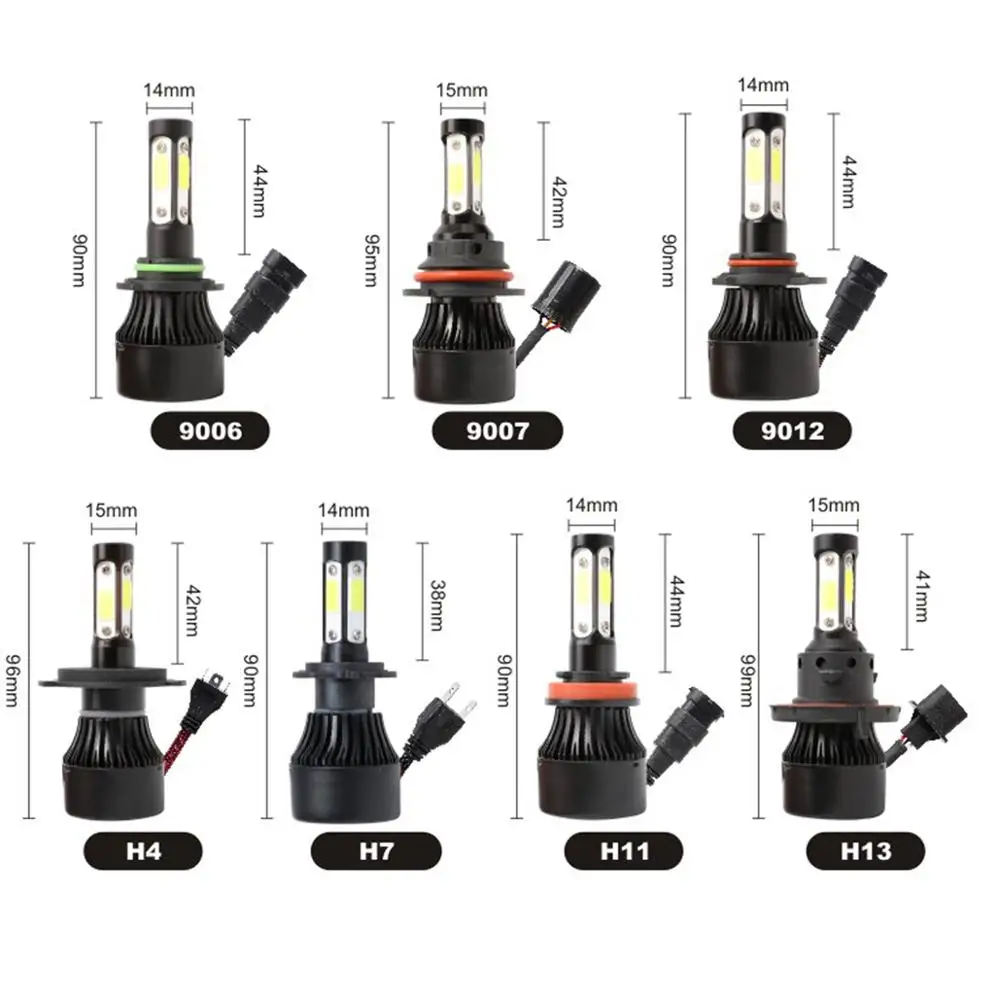 Дальний/ближний свет: H4, H13, 9004, 9007. С 3 стороны COB светодиодный лампы. Одинарный свет: H1 H3 H11/H8/H9 H7 9005 HB3 9006 HB4 H27/880/881 9012 5202. С 2 боковыми COB светодиодный лампы.