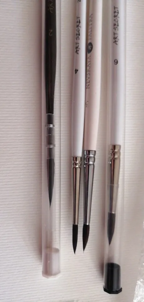 Прибыли хорошо упакованными, каждая кисточка с колпаком, в отдельном тубусе, ещё пупырка и картонная коробкаНа фото для сравнения Невская палитра(3).На кисти с франц. креплением колпачок надет очень плотно(как термоусадка вокруг проволоки, я аккуратно его срезала. Качество кистей превосходное ️
