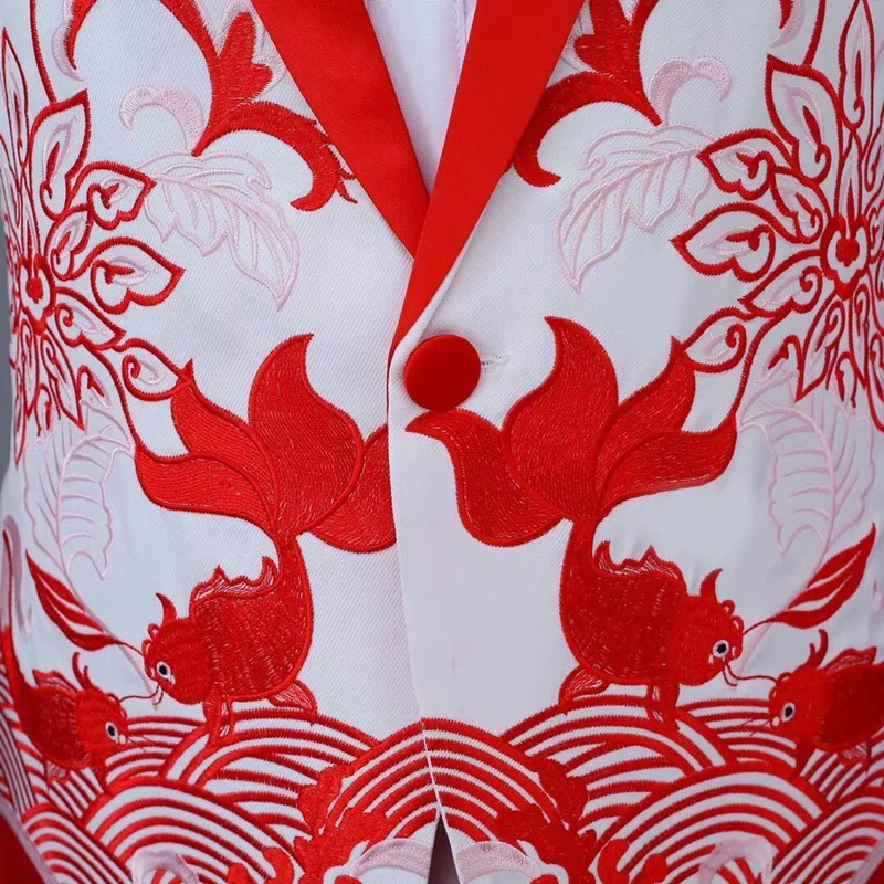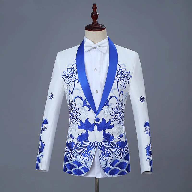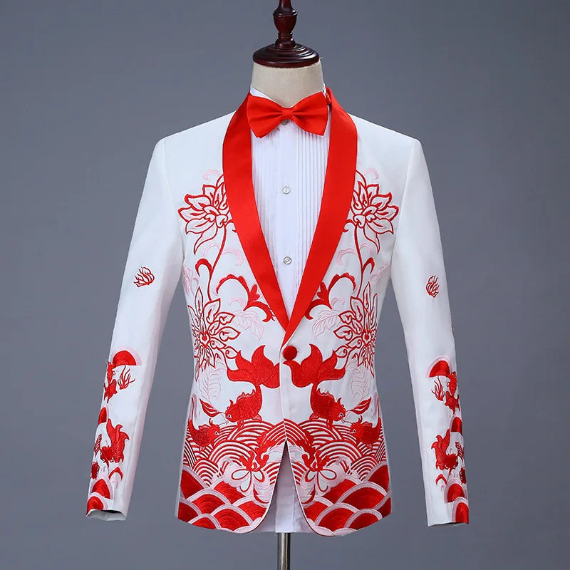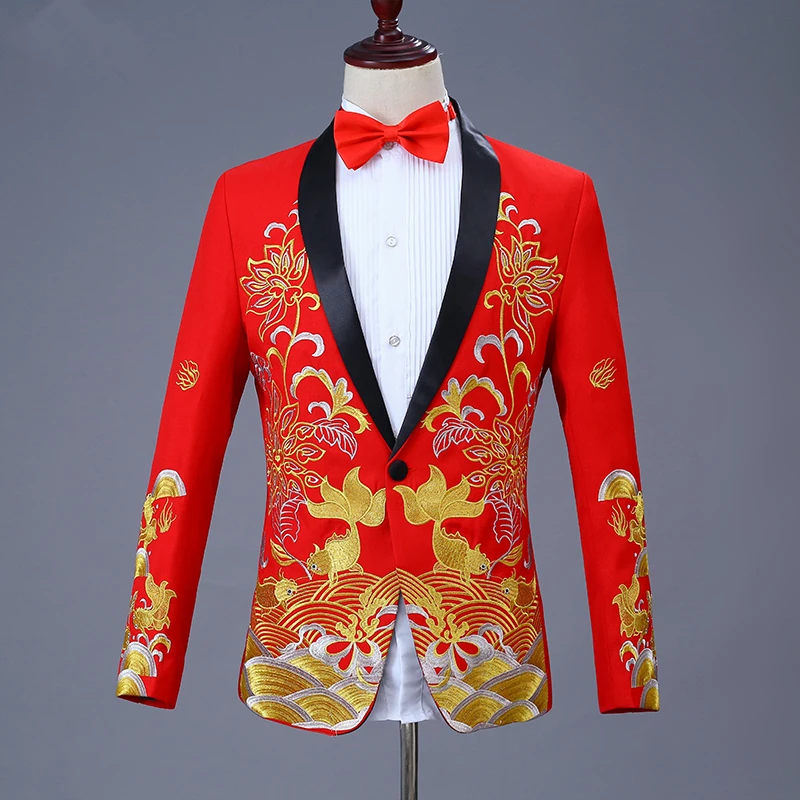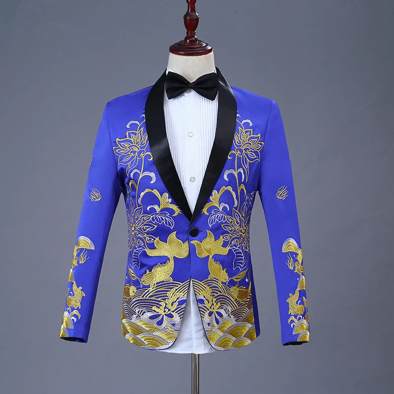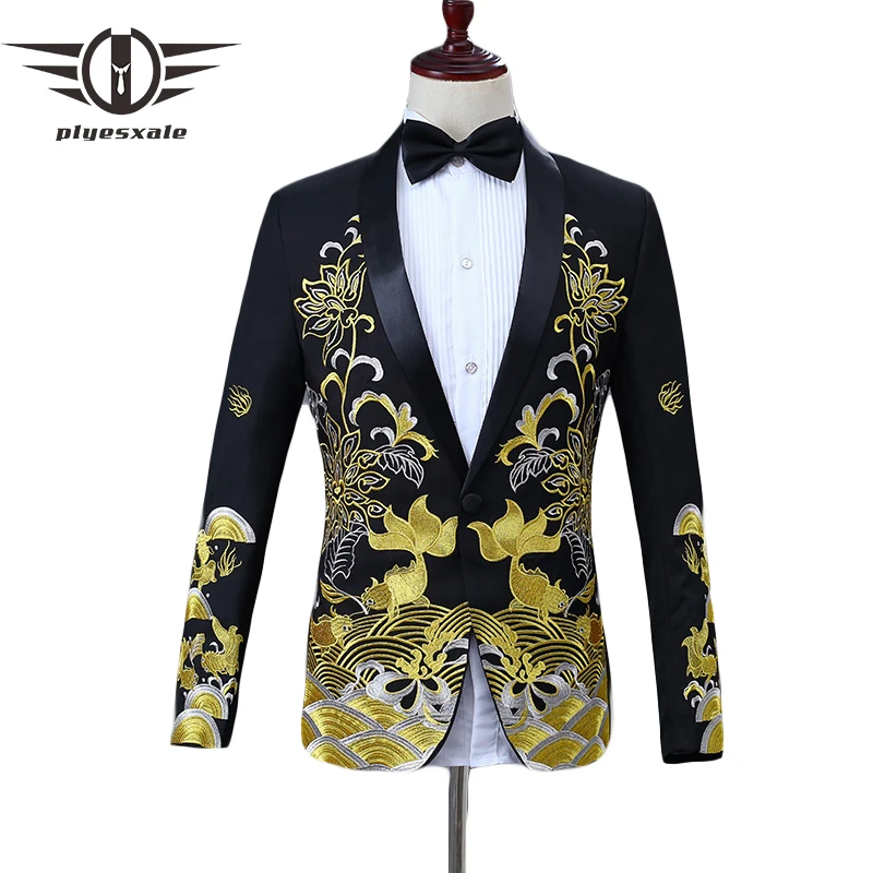 Plyesxale Для мужчин s черного и золотого цвета пиджак китайский Стиль Цветочные рыбы блейзер в полоску с вышивкой Для мужчин шалевым воротником мужской одежда для сцены спортивные пиджаки для выпускного Q108