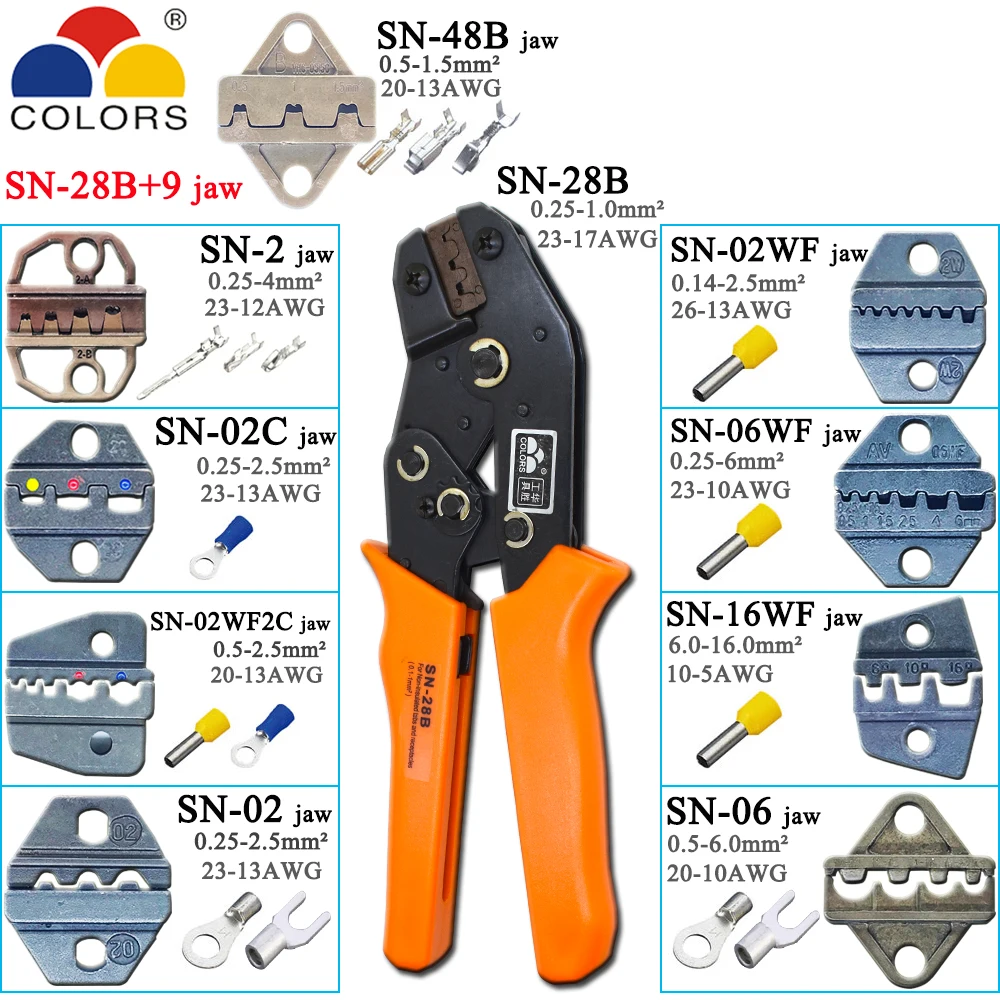 Применение: можно обжимать до 0,5-1мм⊃2; / 1-2мм⊃2; / 2,0-4мм⊃2; / 4-6мм⊃2; Большая часть площади меньше 6 мм²; без клемм.
