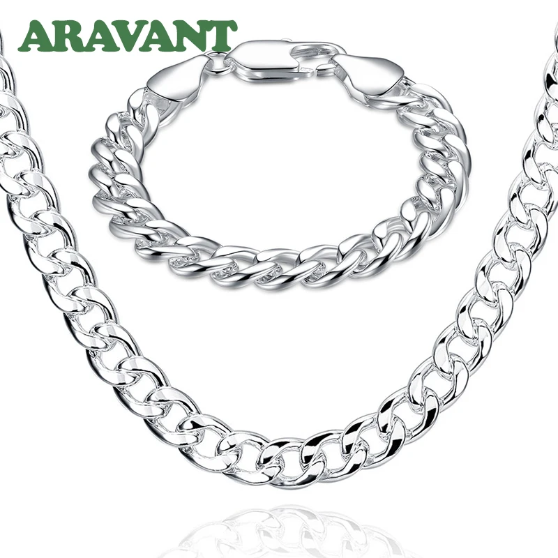 Серебро 925 пробы 10 мм ожерелье цепочка браслет набор для женщин модные ювелирные изделия