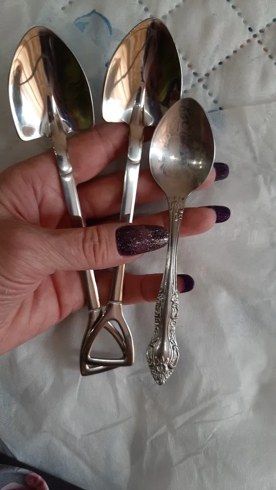 немного острые грани у ложки. забавный подарок для фермера или реквизит для куклы формата 1/6 или меньше. металл. по ощущениям в руках близко к чайной ложке, чем к кофейной. упаковка на фото. с продавцом не общалась.