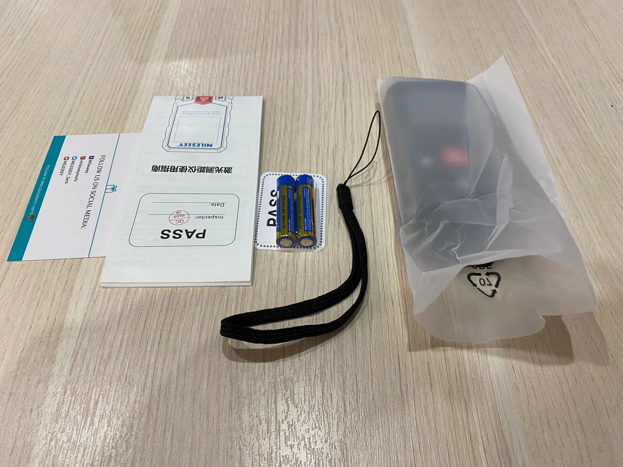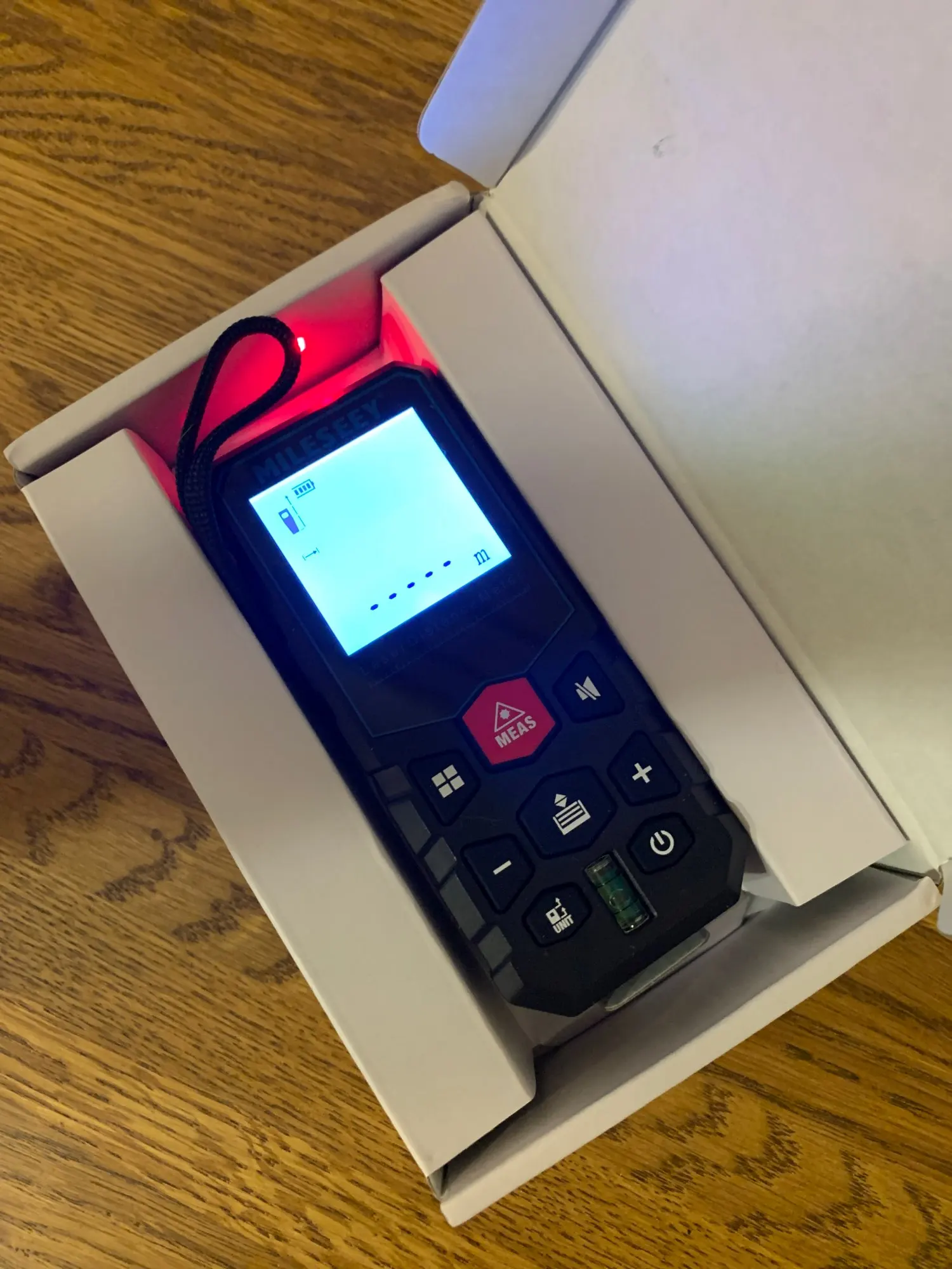 Получил, все работает, углы измеряет точно, расстояния ещё не проверял. В комплекте коробка, чехол, шнурок, 3 мизинчиковых аккумулятора, провод для зарядки. На вид выглядит достойно, детали корпуса подогнаны хорошо