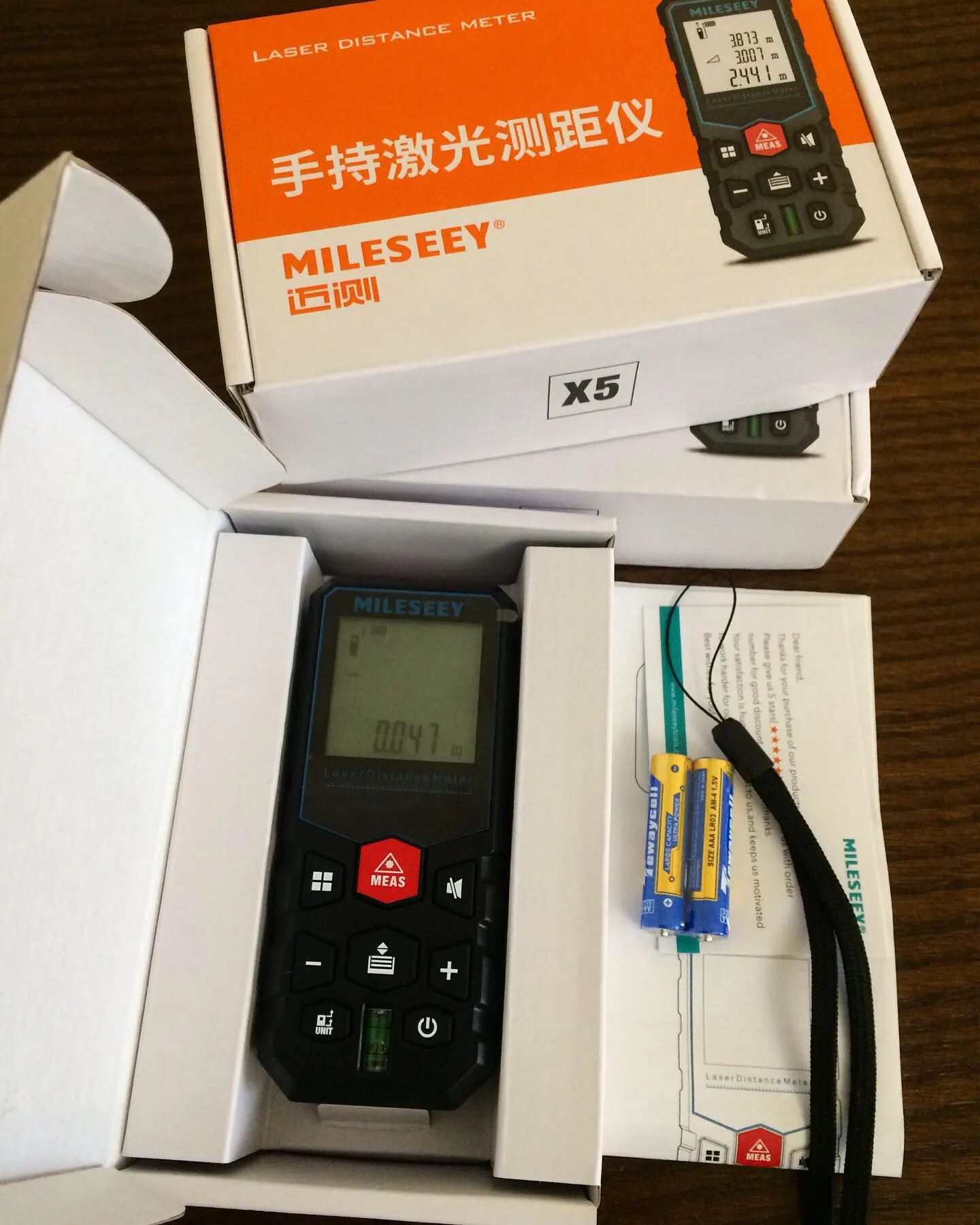Супер! Доставка за 6 дней через всю Россию с момента заказа и до вручения курьером в руки. В комплекте есть подробная инструкция на английском, чехол, ремешок и даже батарейки. Измеряет точно, на 5 метрах показала на 3мм больше ленточной рулетки. Пластик качественный, сделано все аккуратно. Я доволен. Рекомендую!