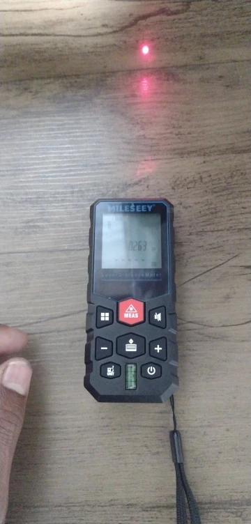 У дальномера луч не параллелен сторонам прибора, крышка аккумулятора выпирает и не дает ровно приложить прибор к основанию... На фото линейка 1,5м. Из-за луча под углом, считаю угловые измерения неточные((( Точка зеленого лазера как овал... Видна хорошо, подставлял алюминиевую линейку. Продавец неточность прибора отрицает... ссылается, что луч не посередине прибора...