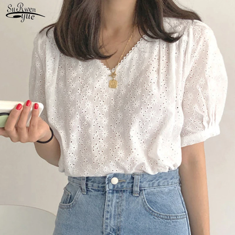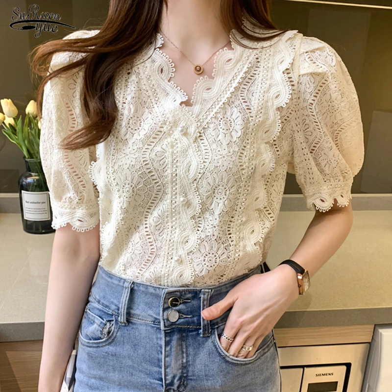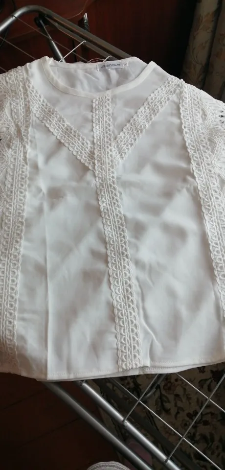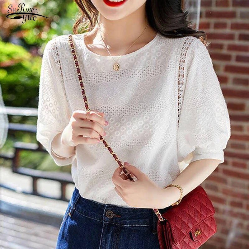 2019 Женские топы и блузки кружева пэчворк Корейская модная одежда плюс размер однотонная женская рубашка, блузка лето 4835 50