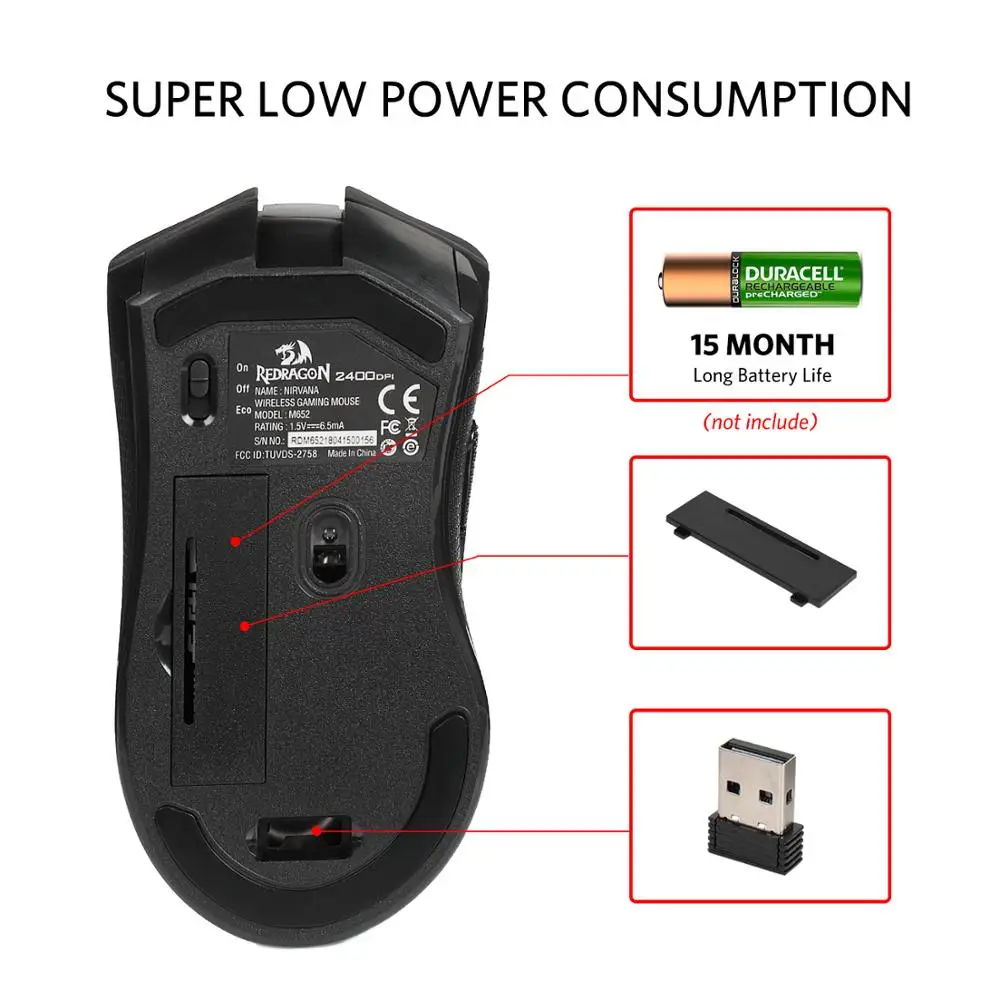 Игровая мышь Redragon M652, USB-приемник, беспроводная мышь, Портативная оптическая мышь, 2,4 ГГц, 5 регулируемых уровней DPI, 6 кнопок, для LOL