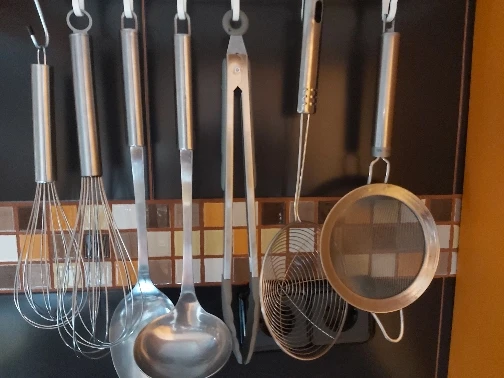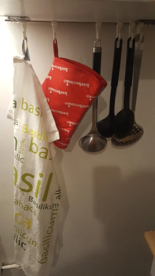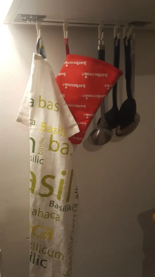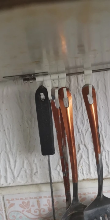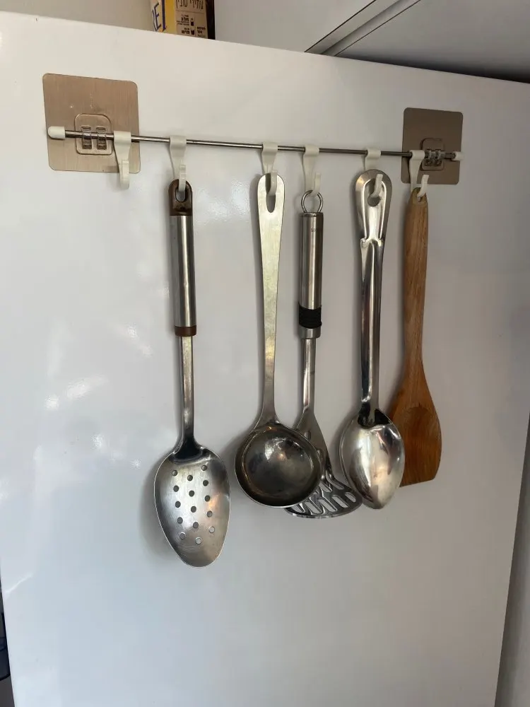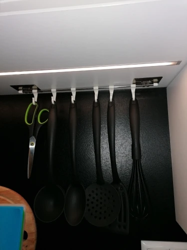 К продавцу никаких претензий, всё ок. Рейтинг хлипковат, заглушки на концах прутка не держатся (это легко поправить, обмотав кончики изолентой), форма крючков не универсальна - не любую поварешку получится повесить.