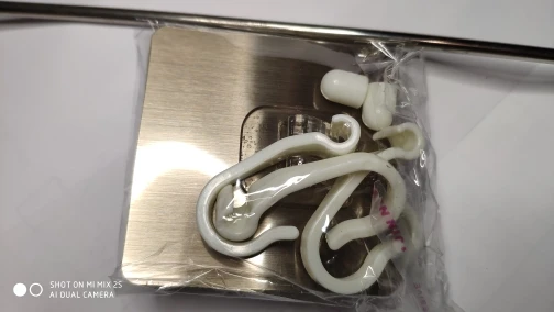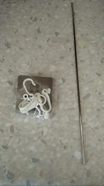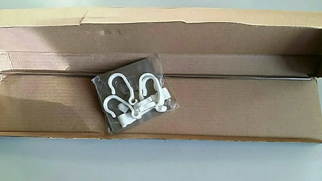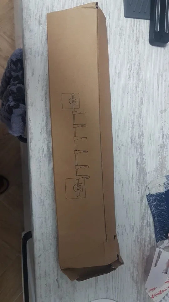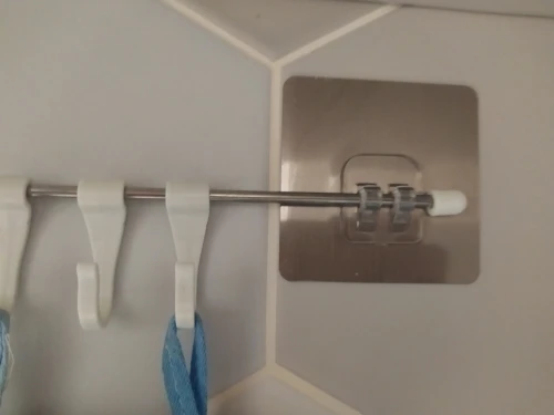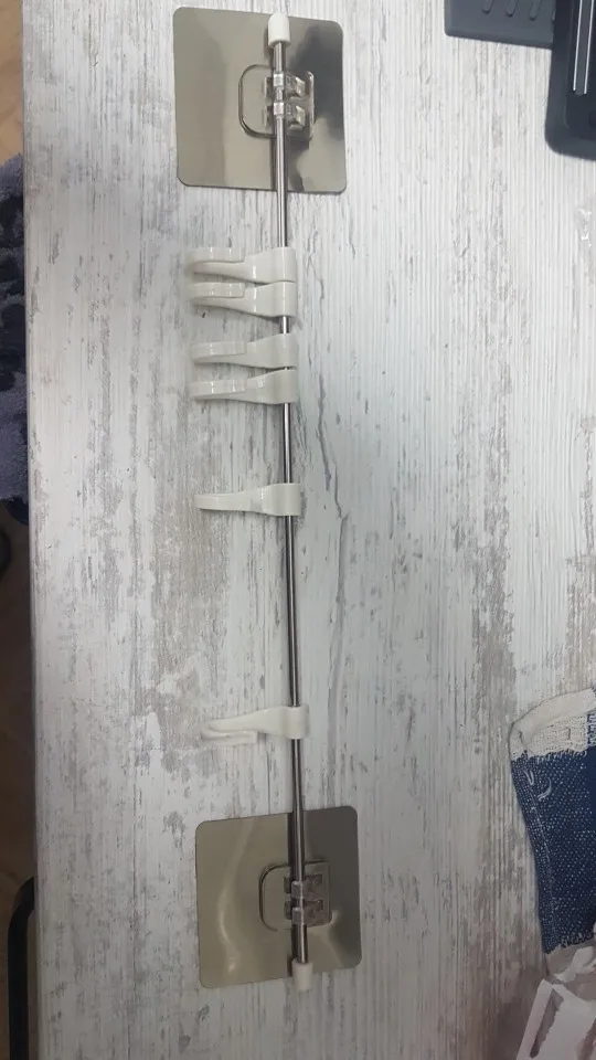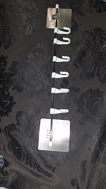 Брала два товара. Пришло хорошо упаковано. Товар функциональный. Один металлический прут, на который одеваются пластмассовые крючки. Заглушки тоже пластмассовые, держаться не плотно, слетают. Приклеилось хорошо. Можно клеить, как на стену так и под полку, удобно. Фото не стала делать, соответствует.