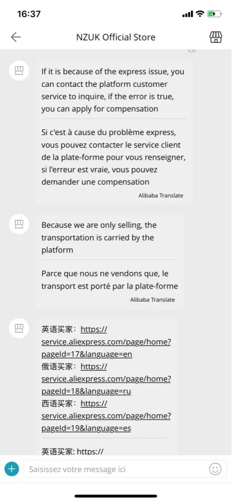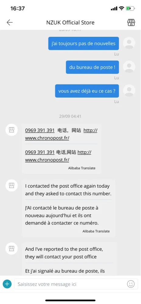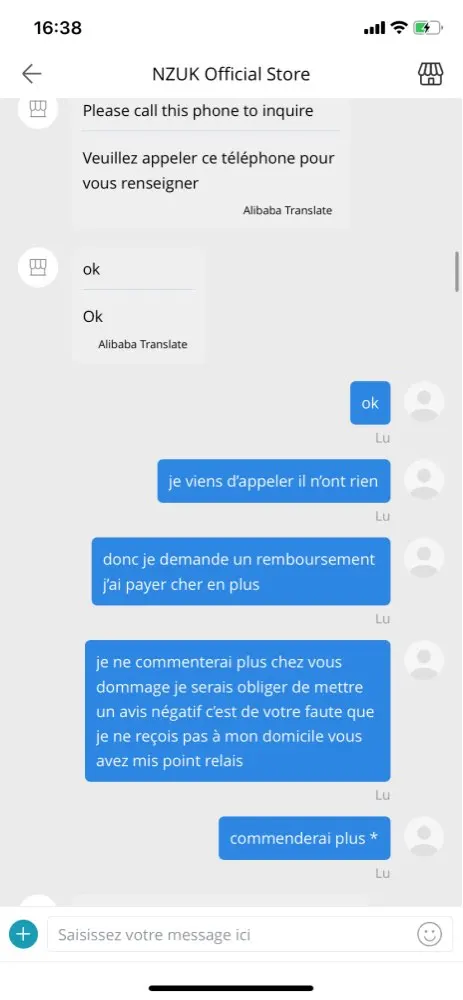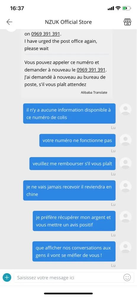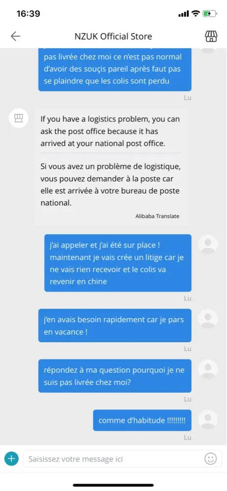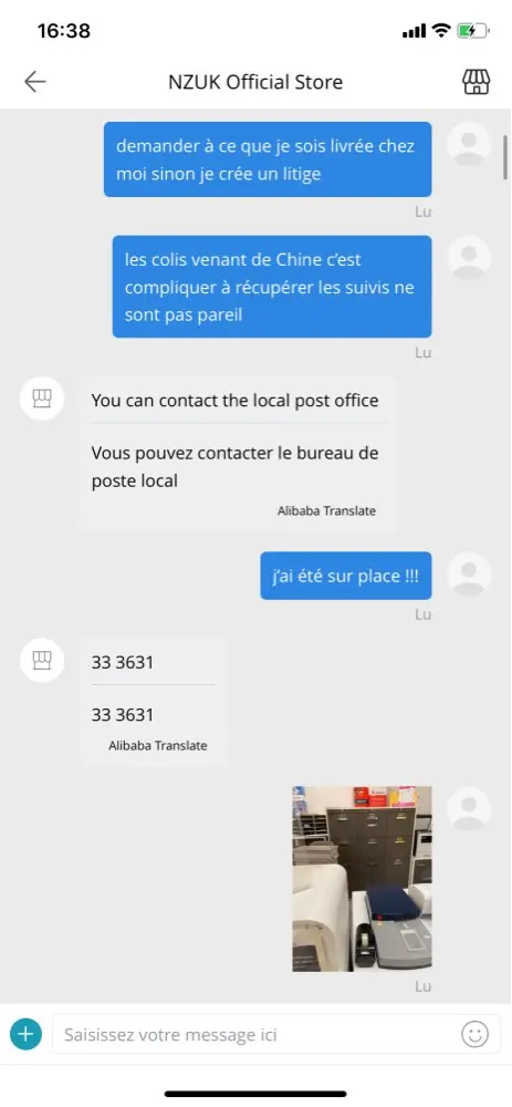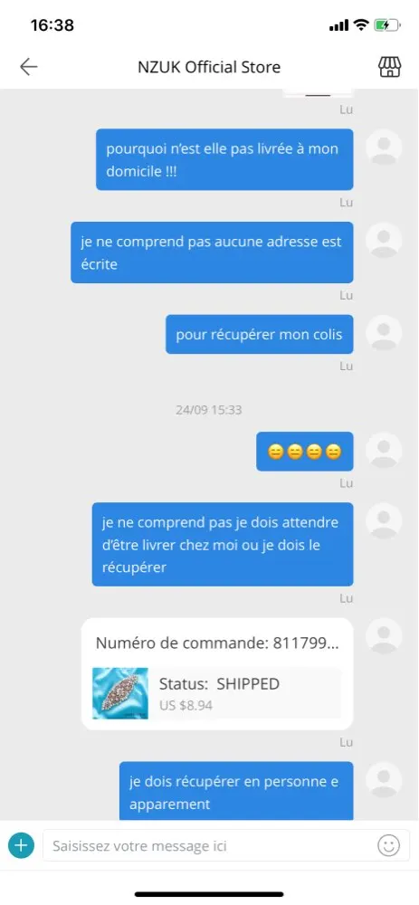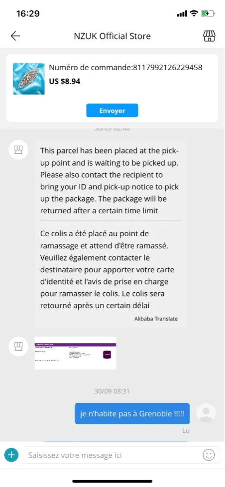 Я никогда не получил свою посылку, и продавец без ума от меня, доставив свою посылку в ретрансляционный пункт в другом месте в моем городе, я жижу на востоке Франции, а продавец доставляет меня в Гренобль и прошу меня связаться с нами, я не знаю, кто с номером оплаты! Вот доказательства платформы он прав Это афера я сделал себе почти 8 евро за 2 посылки nexttt