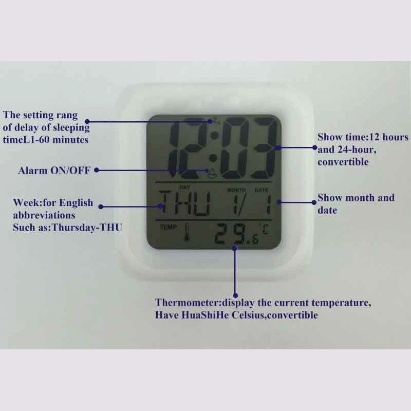 1. Нажмите на верхнюю часть часов, часы загорятся и изменятся на 7 разных цветов в течение нескольких секунд 2. Сигнализация и спящий патруль3. Будильник, работающий от 2x AG13 кнопочных батарей (не входит в комплект)