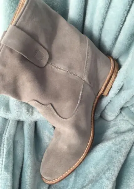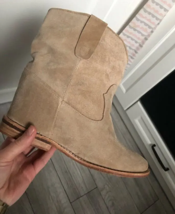 Замшевые женские байкерские ботинки из телячьей кожи, мотоциклетные ботинки на плоской подошве, увеличивающие рост каблук, ковбойские ботильоны в стиле ретро