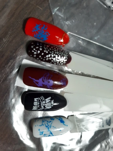 хорошие лаки,очень даже. легко отпечатываются.все целое пришло,но долго ждала (2.5 мес)