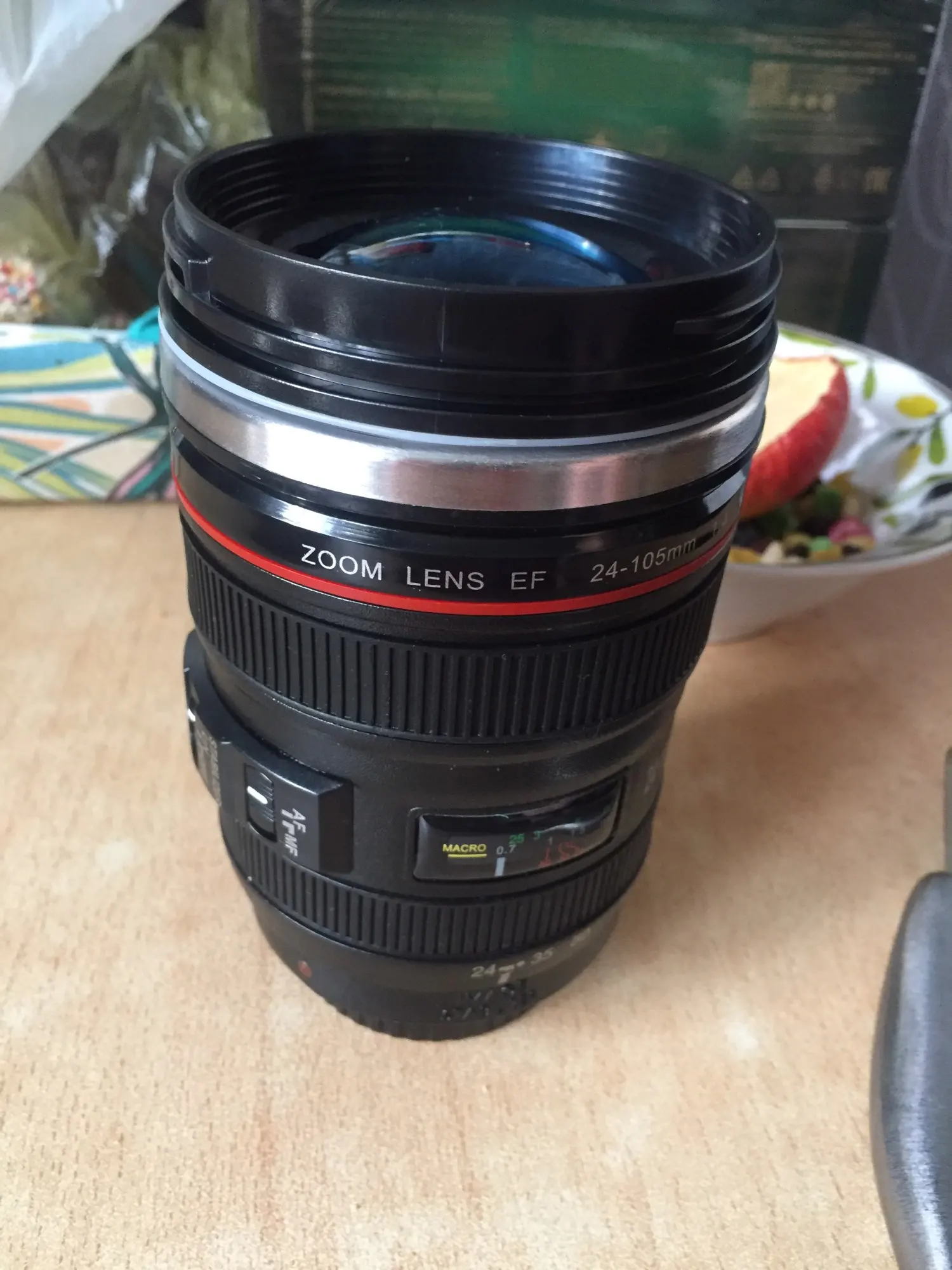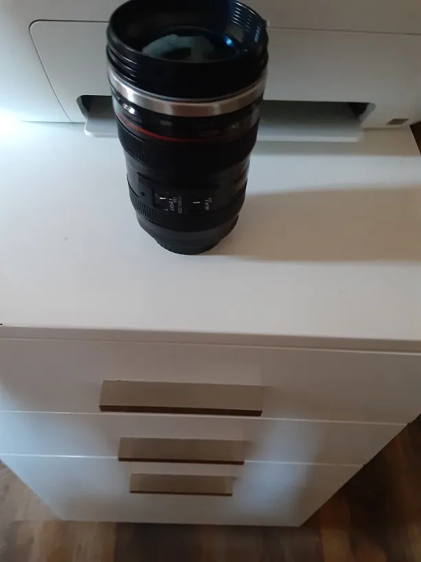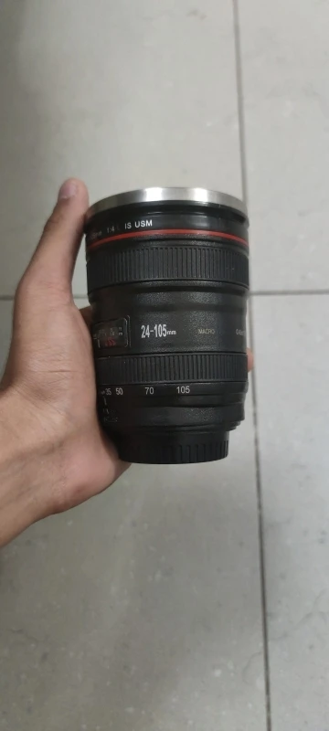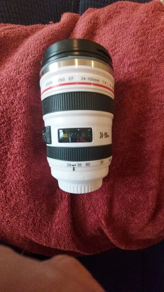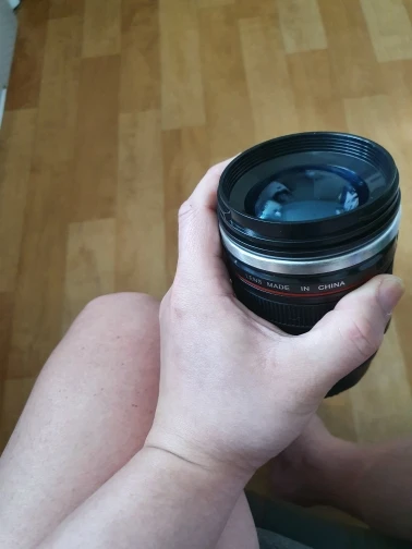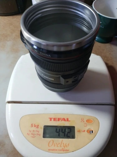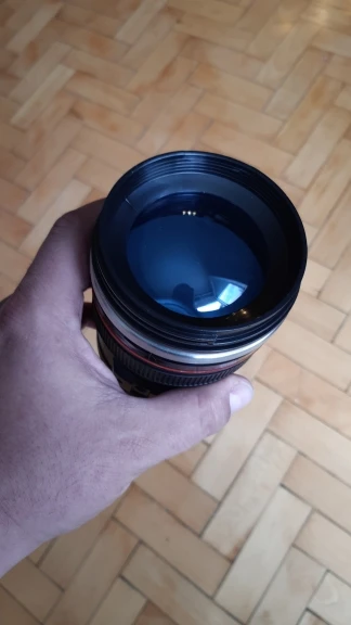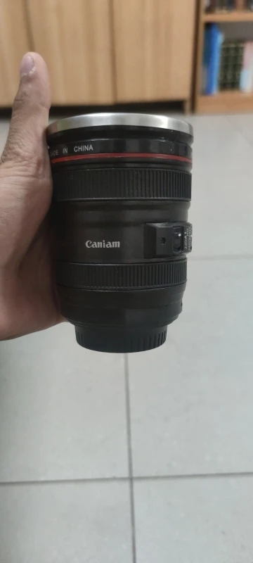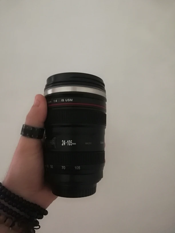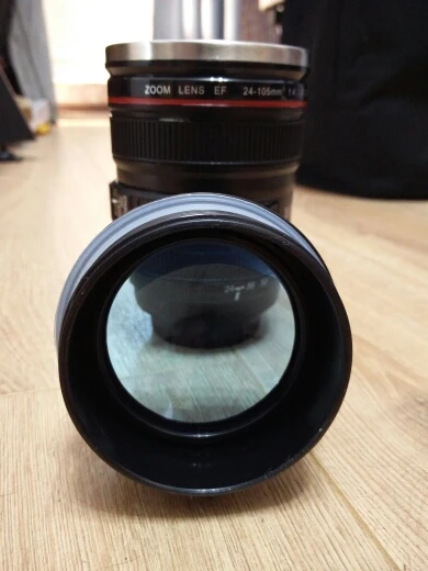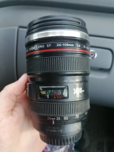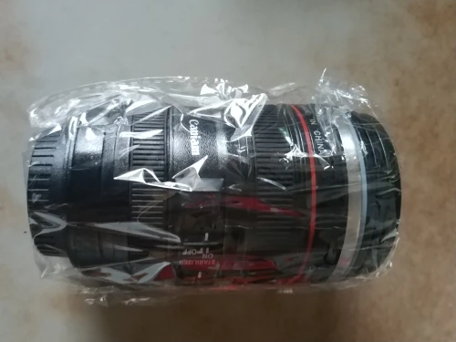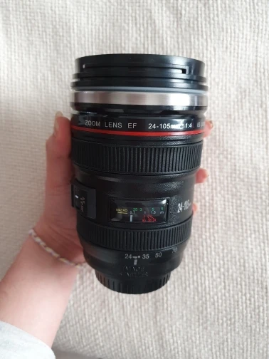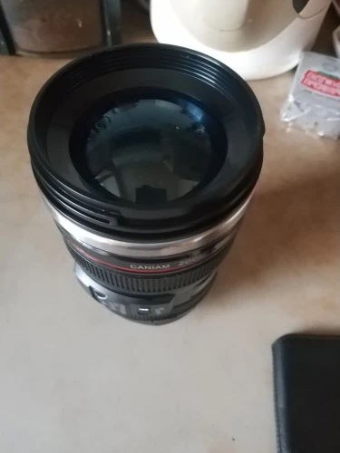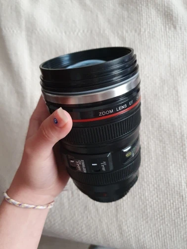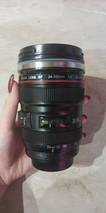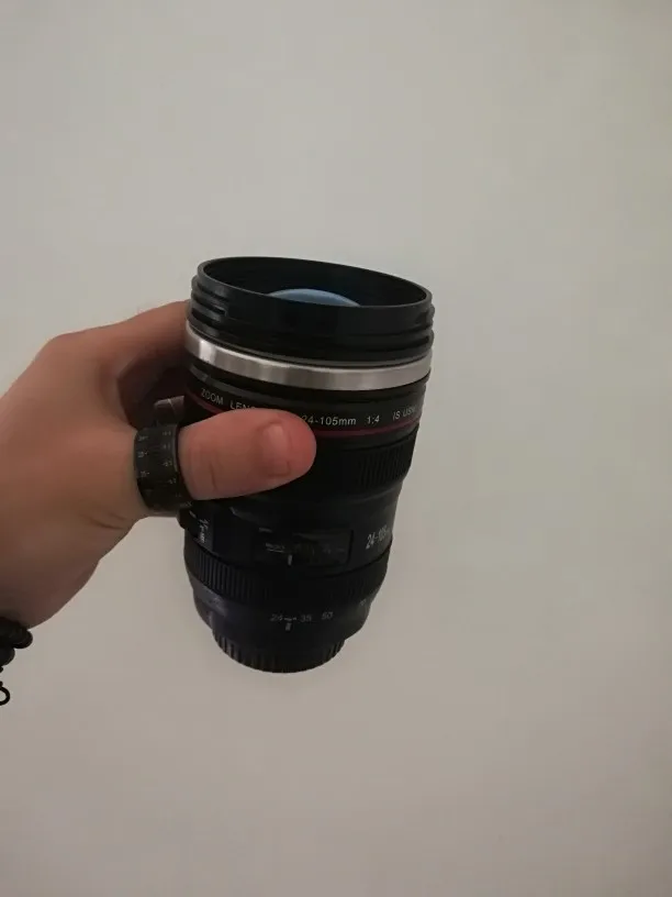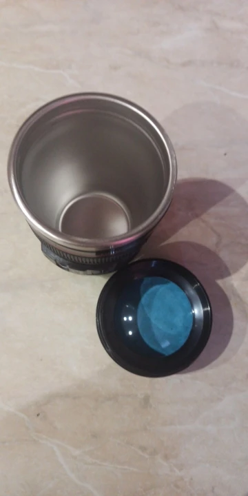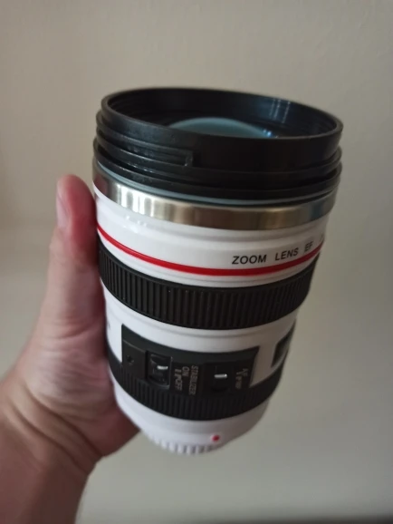 Внешне выглядит как объектив на 100%! Очень круто смотрится! Внутри - емкость на 400мл, двойные стенки из нержавеющей стали.