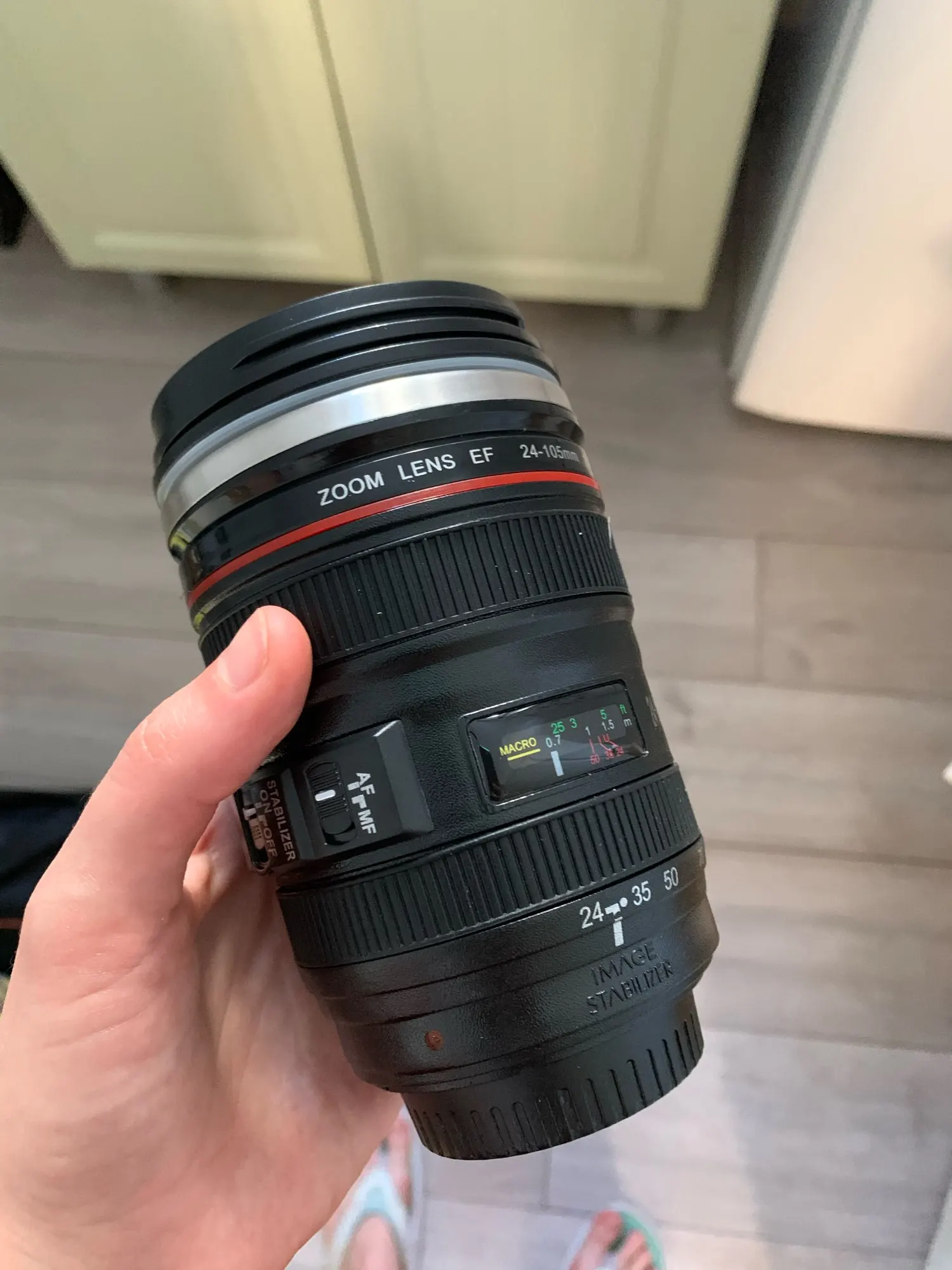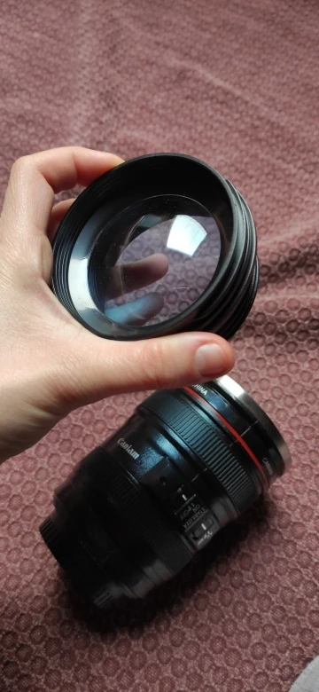выглядит прям как настоящий объектив,все надписи,черточки,.брали в подарок,увы нет коробки