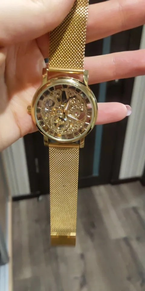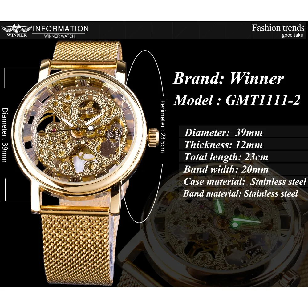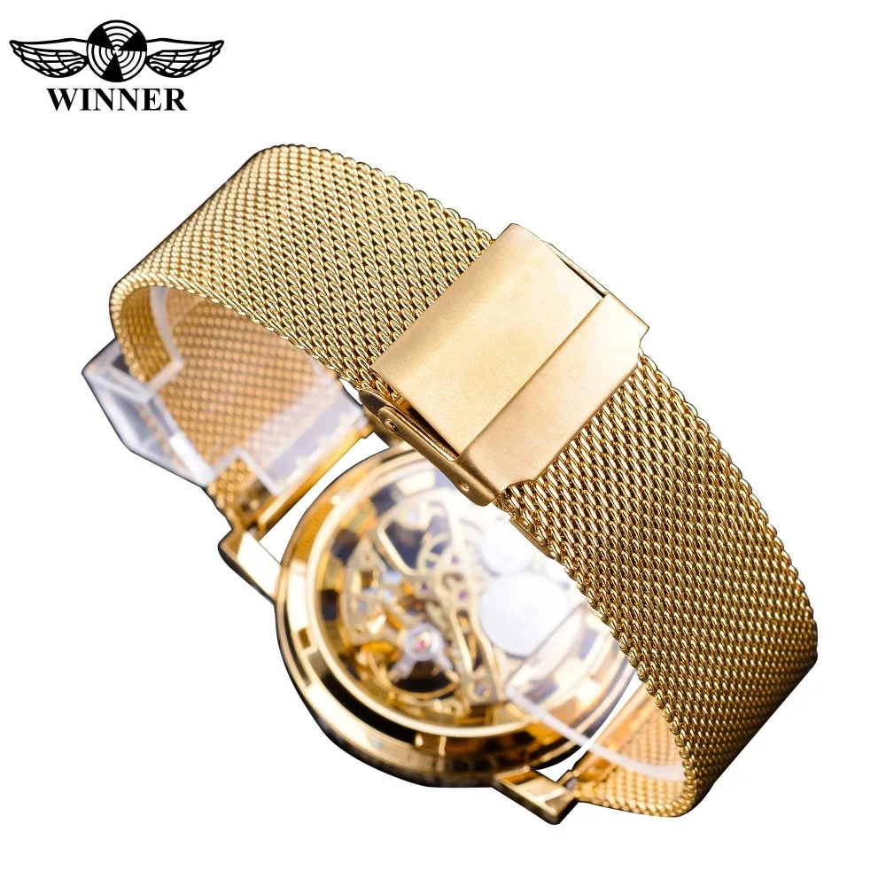 Мужские механические часы Winner, тонкий чехол в стиле ретро, ажурные, с сетчатым ремешком, блестящие стрелки