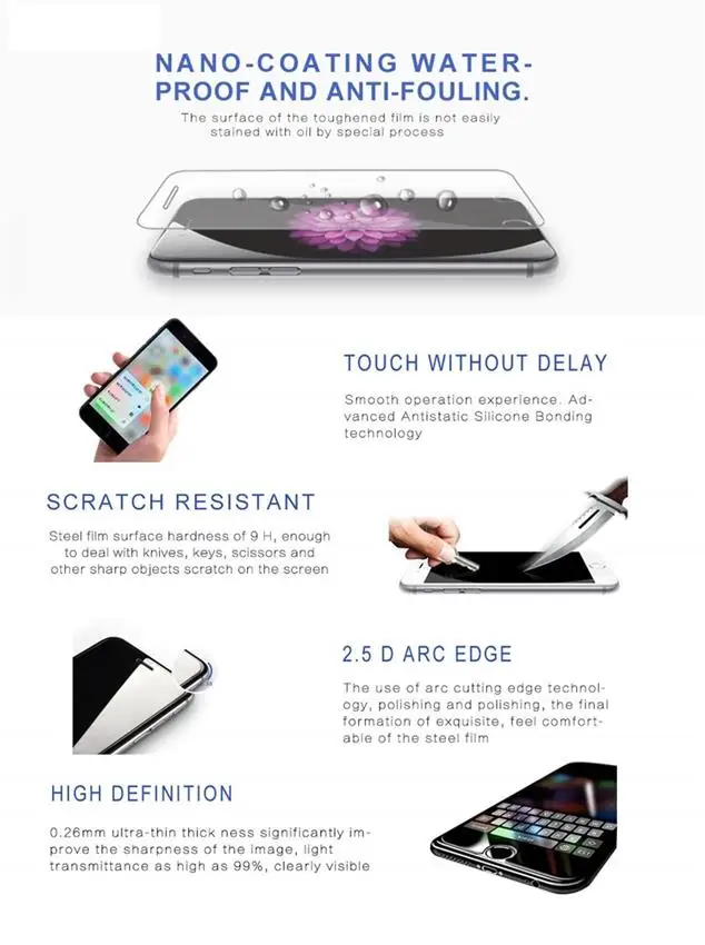 [Чувствительность]: ультра тонкий 0,2 мм толщина является надежной и простой в обращении, и обещает Полная совместимость с устройствами с сенсорным экраном, чувствительность, использование сенсорного скорость отклика обеспечивает высокое качество[Защита от царапин]: твердость 9H значительно выше, чем обычная пленка 3H твердость, закаленное стекло эффективно защищает ваш экран мобильного телефона от царапин, пыли, царапин, посуды, взрыва и ударов[Высокая четкость]: Прозрачная отделка обеспечивает четкость экрана и гладкость поверхности, 99.9% прозрачное гидрофобное и олеофобное покрытие экрана защищает от пота, остатков масла от отпечатков пальцев[Высокая Адсорбция]: без пыли, без отпечатков пальцев, закаленное стекло с одним нажатием супер легкая установка, занимает всего несколько секунд