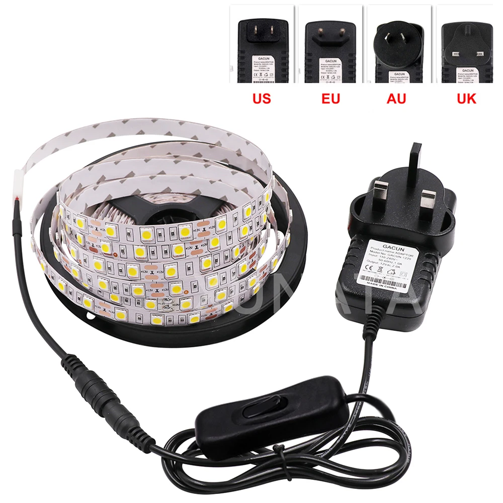 Водонепроницаемая гибкая светодиодная лента 12 В постоянного тока с вилкой для ЕСАвстралииСШАВеликобритании, Светодиодная лента 5050 60, краснаязеленаясиняябелаятеплый белый с переключателем