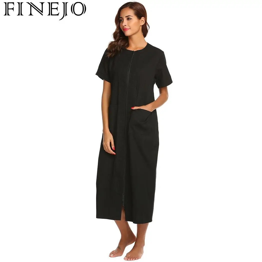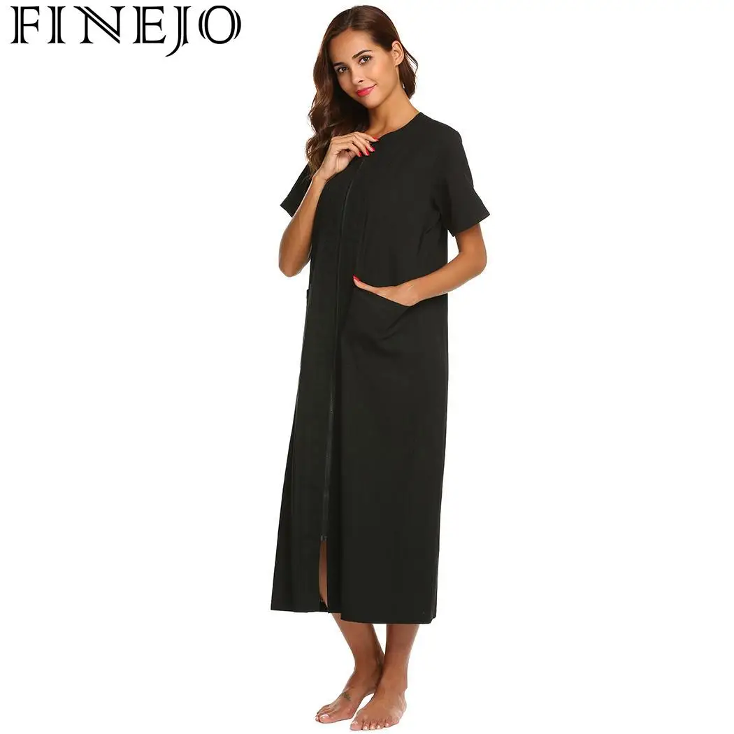 FINEJO женская ночная рубашка с круглым вырезом и коротким рукавом, длинные халаты на молнии, женские ночные рубашки, женское платье для сна