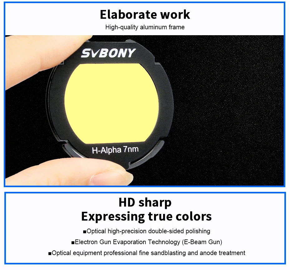 Из-за того, что H-Alpha-656 нм, в основном благодаря высокой проницаемости спектра, и 656 нм спектра цветов, представленных красным, глубина обрезания 300-1100nm для получения деталей о запуске nebula richer. Сверхузкая полоса пропускания позволяет пропускать фильтр только с диапазоном 656 нм, может эффективно отключать искусственный свет на лампах и помехи Hg для передачи через трубу, для улучшения контраста в туманности. С CCD-лучший выбор для глубокой фотосъемки с неба и широкоформатной астрофотосъемки.