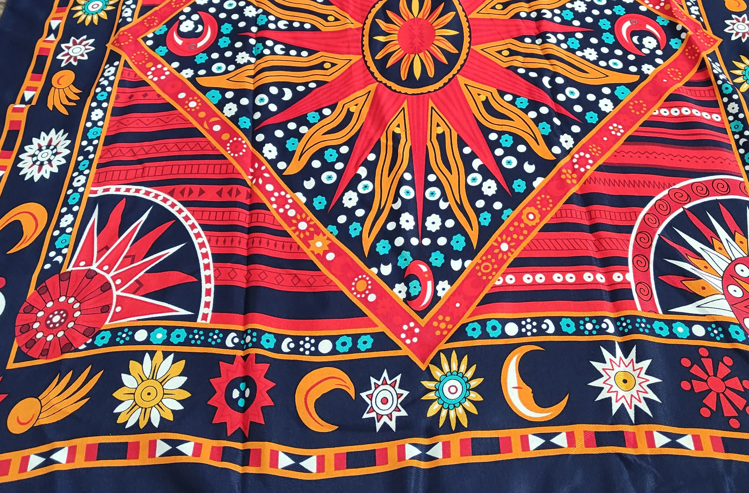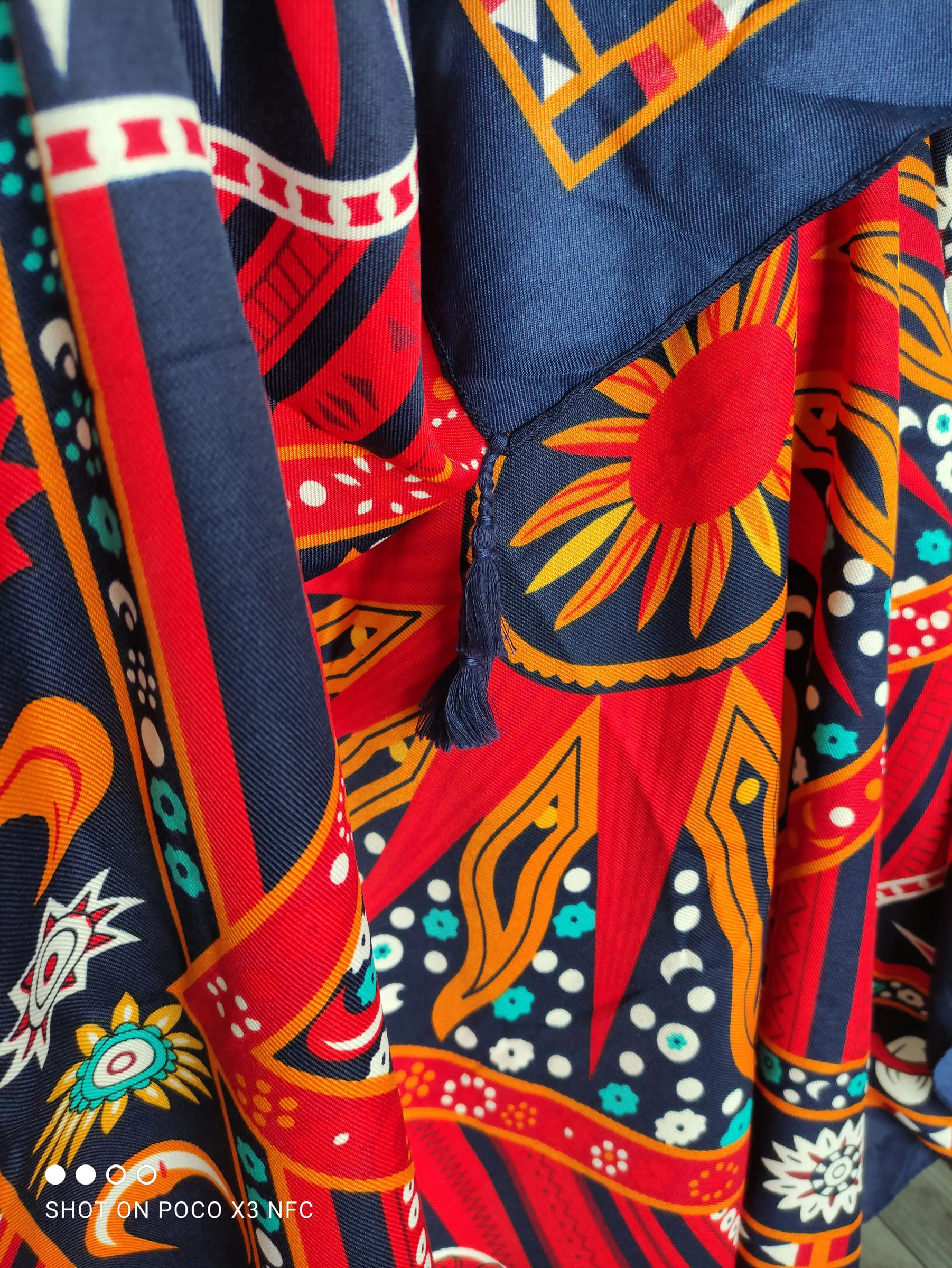 шарф изумительный! яркий, сочный, чёткий рисунок, ровные кисточки. пришёл очень быстро в Мск вместе с другими посылками. вживую даже красивее, чем на фото продавца!
