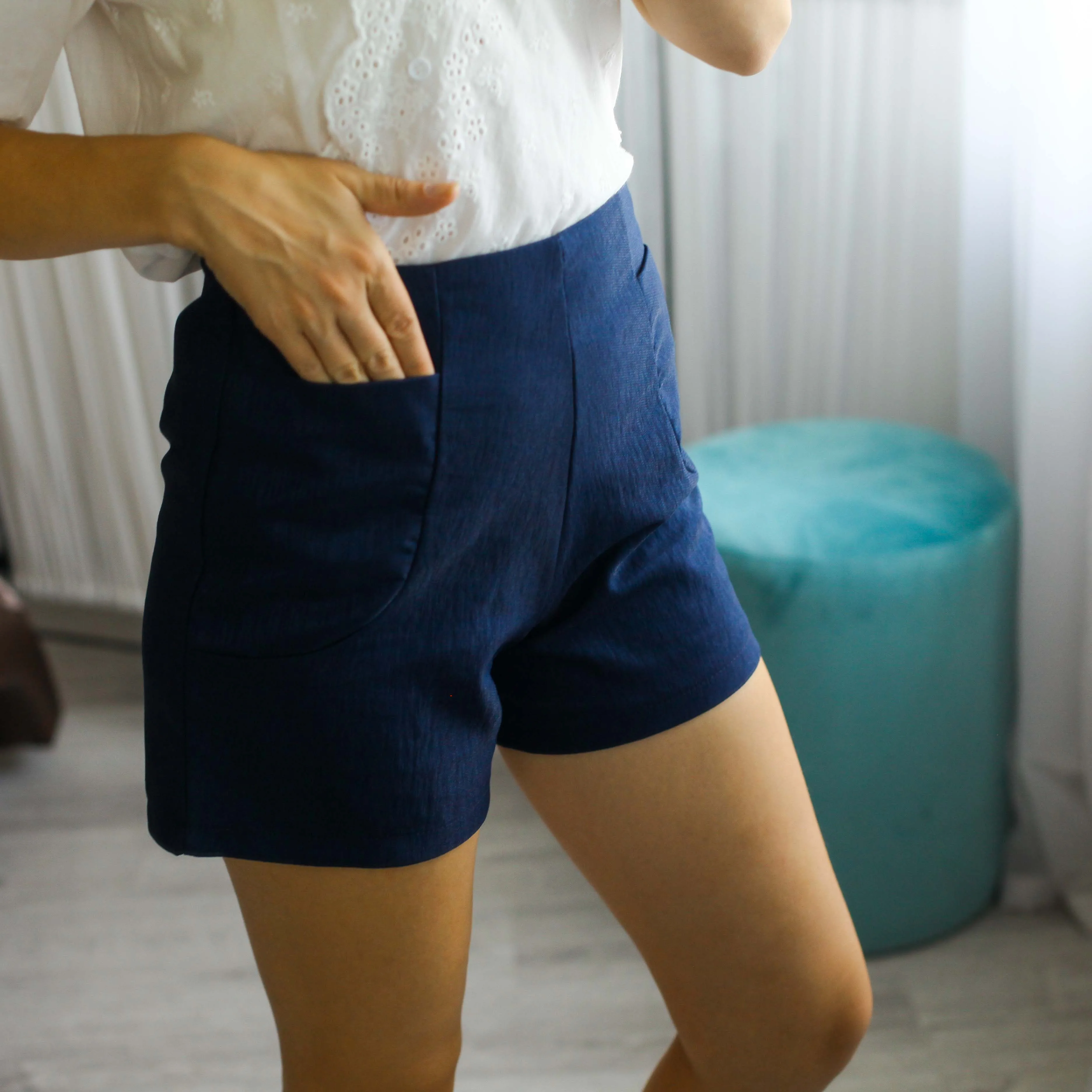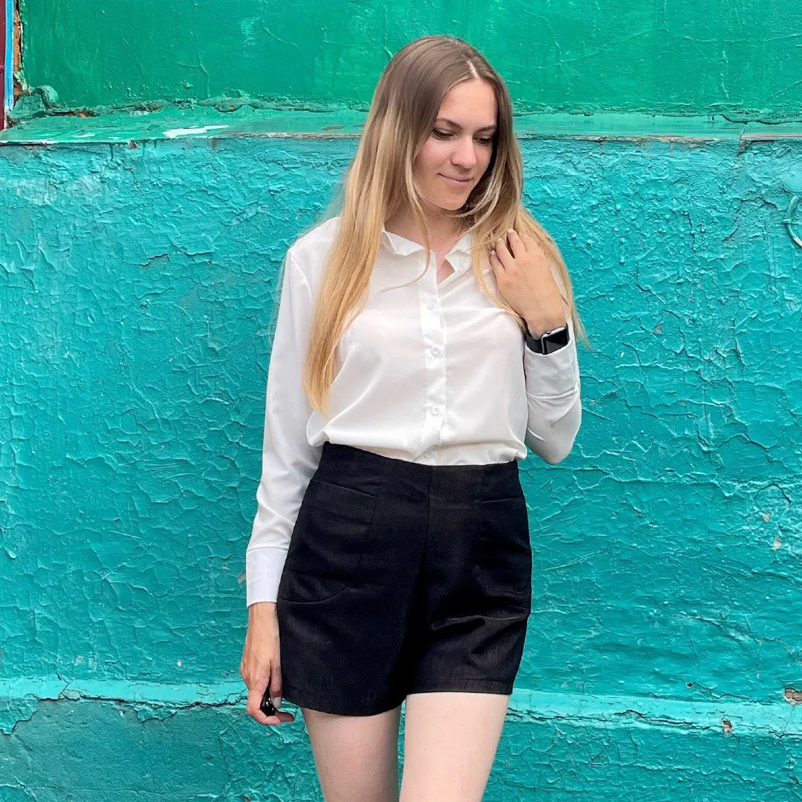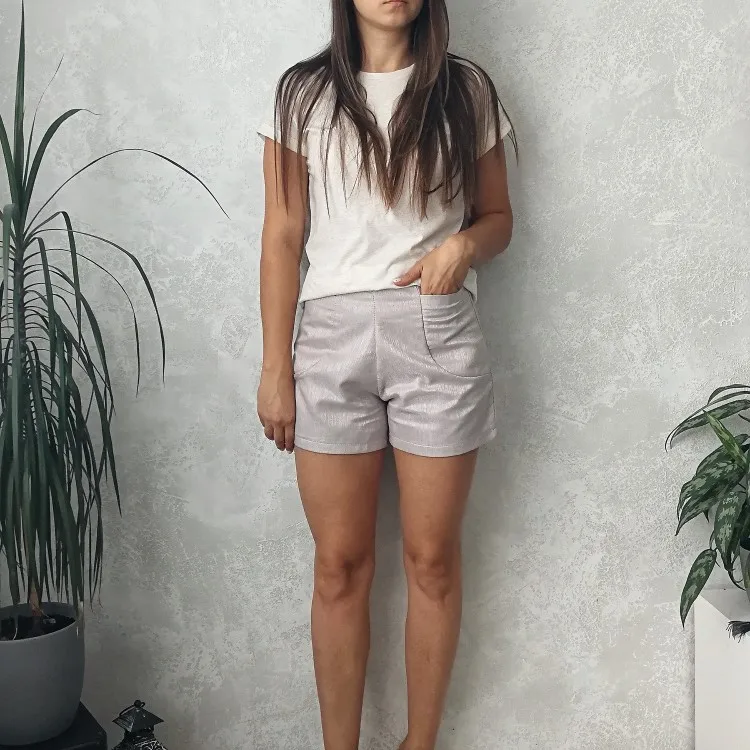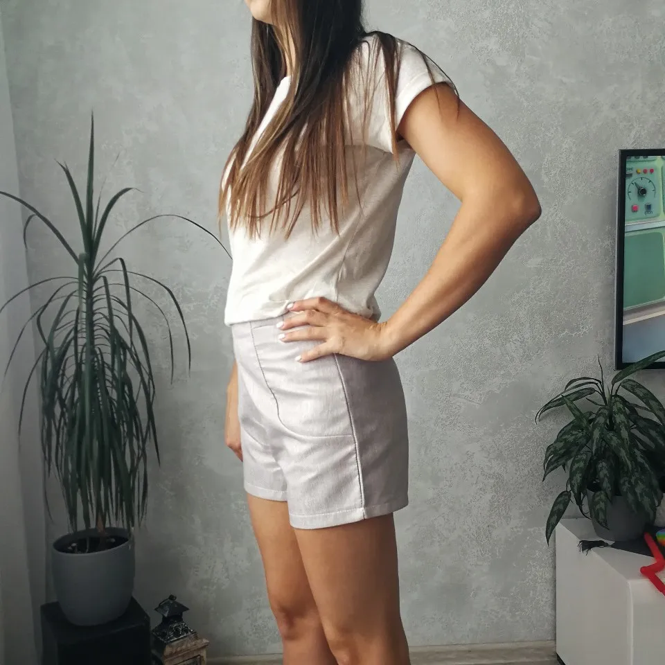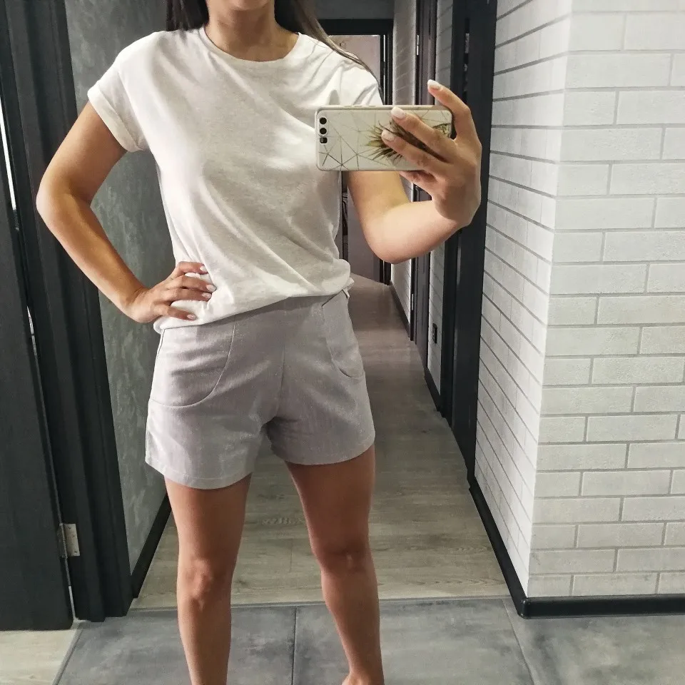 шорты очень понравились. сидят отлично размер S. Ткань чуть тянется, по бокам карманы. Застежка потайная молния сзади. Высокая посадка. Визуально ноги вытягивает. Цвет белый , на лен похожа ткань немного. Доставка 3 недели. Брала для моря. Очень комфортно в жару. Советую. Thank you❤