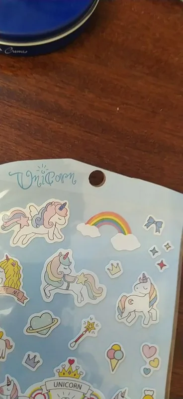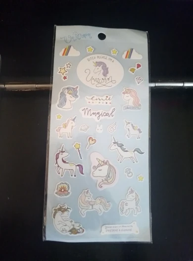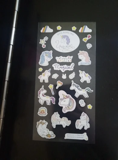 Заказ от 19 августа, пришёл 25 октября (шёл 68 дней). Но, поскольку, доставка платная, в страну прибыл довольно быстро. Упаковка помятая немного, но наклейки не пострадали - они плотные и их можно клеить не только на бумагу. На двух присутствует баг - ошибка в принтере в виде синих полос (внимание на гриву и пурпурный хвост). Многие мелкие наклейки не совсем аккуратно обрезаны.