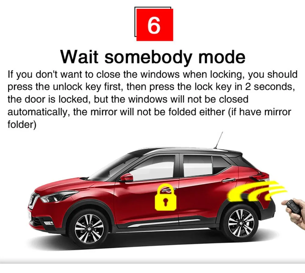Если вы не хотите закрывать окна при блокировке, сначала нажмите кнопку разблокировки, затем нажмите кнопку блокировки в течение 2 секунд, дверь заблокирована, но окна не будут закрыты автоматически, зеркало также не будет сложено (если у вас есть зеркальная папка).