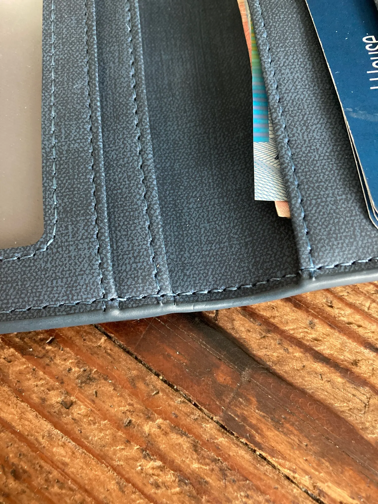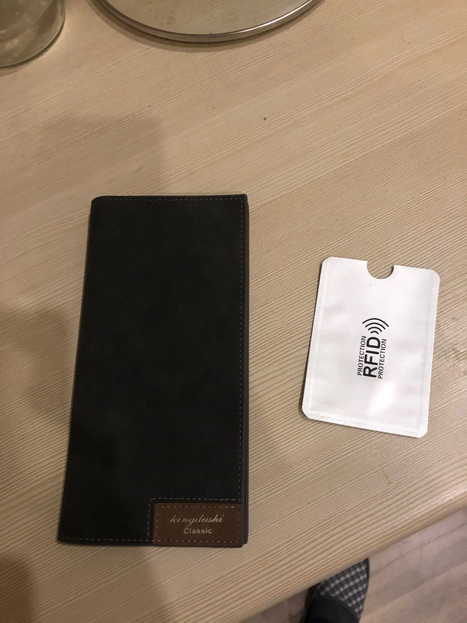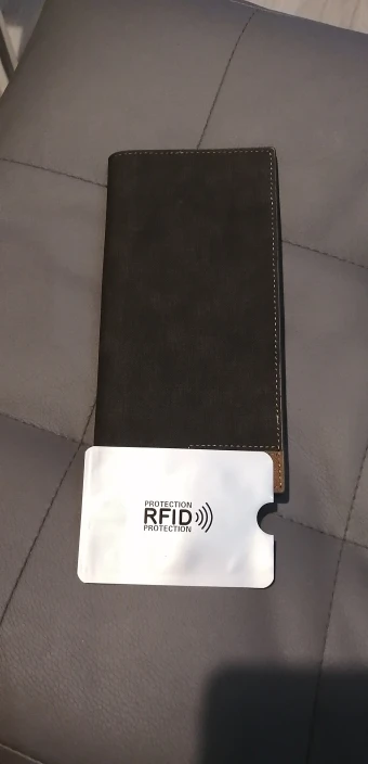 Если честно, думал, что кошелёк будет с текстурой, будто из ткани сделан, но текстура гладкая. В комплекте идёт чехол для карточки, который anti-rfid. Удобный, но достаточно длинный, после компактных квадратных. За свои деньги, как говорится, топ. Правда, так как я нищеброд, пачку купюр не напихивал, поэтому тут не могу сказать, как будет выглядеть кошель.