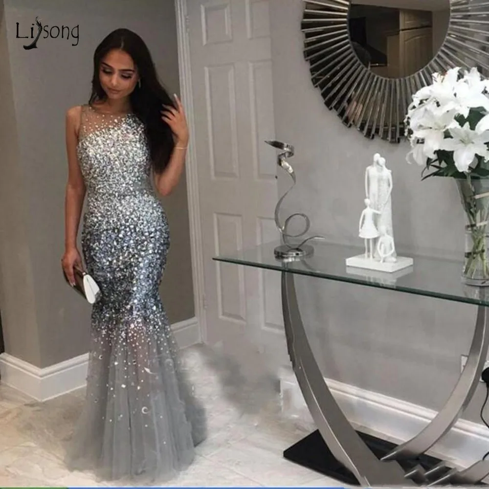 Роскошное длинное серое платье-Русалка с кристаллами, бисером, для выпускного вечера, из Дубая, бальное платье для выпускного вечера