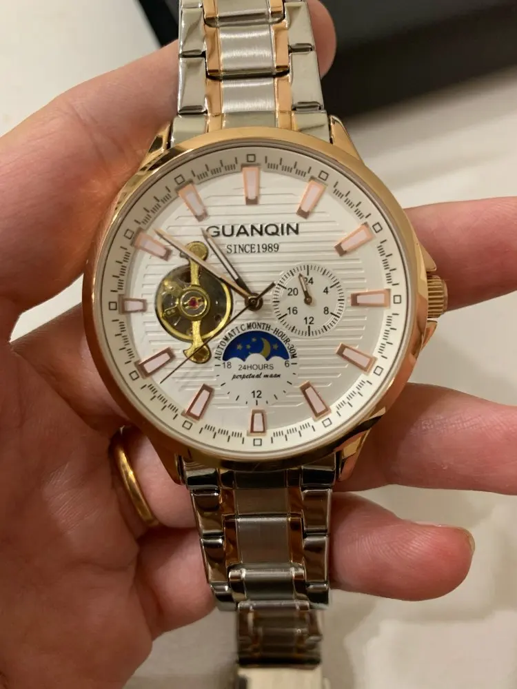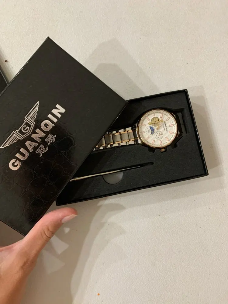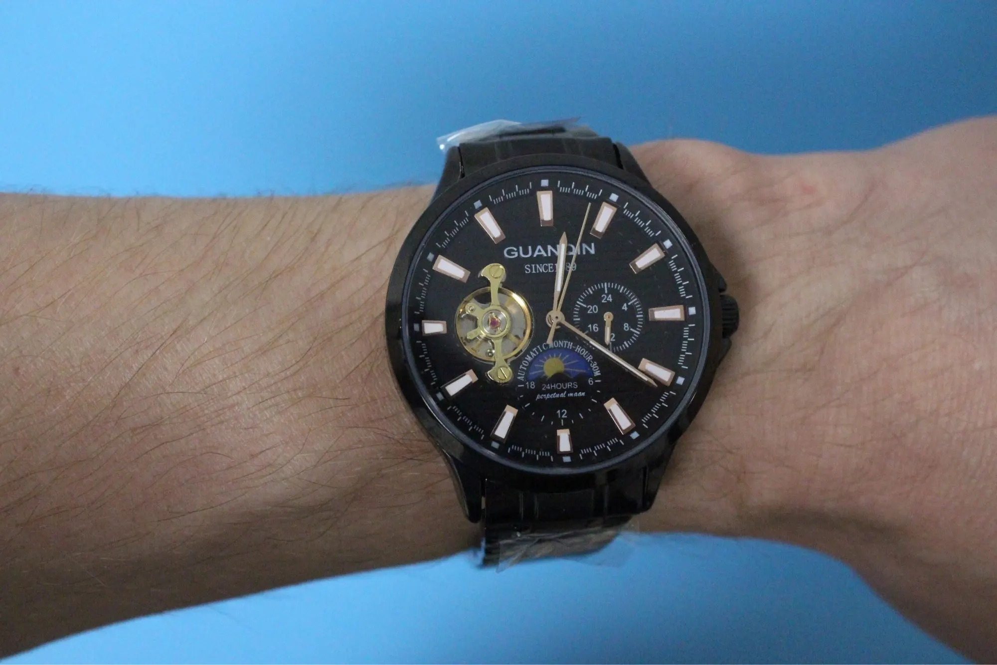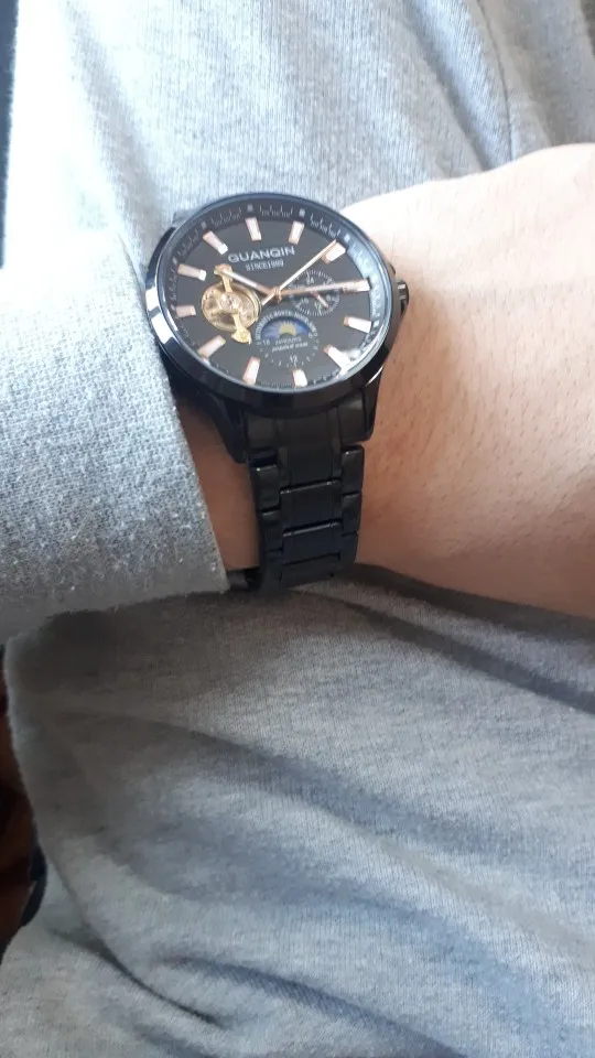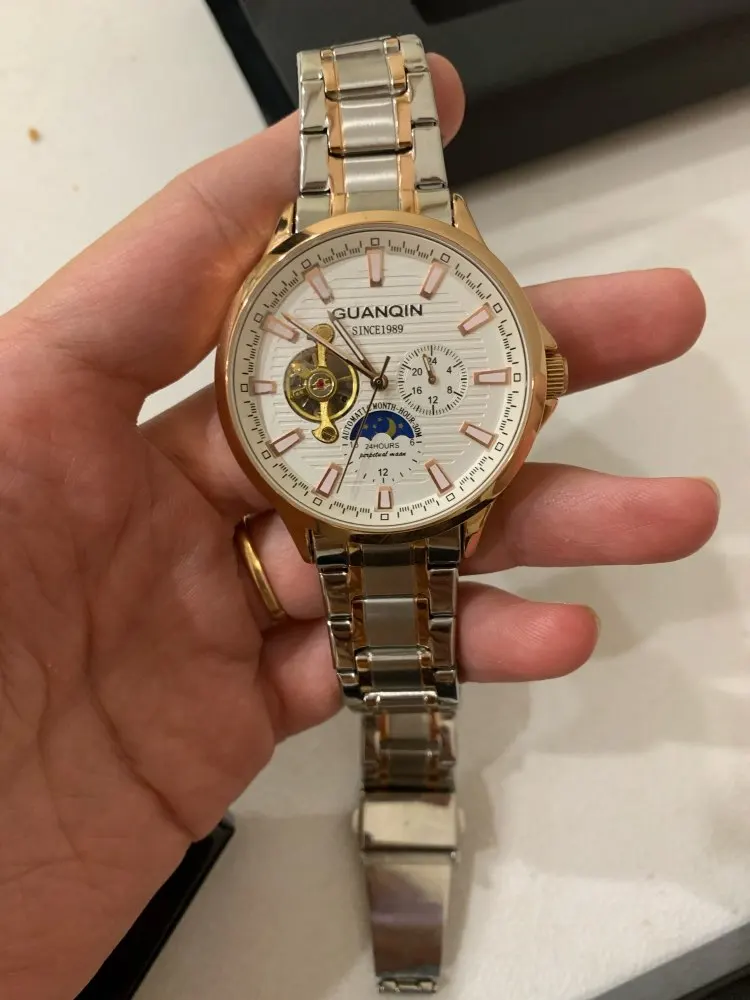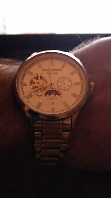 Отличные часы по хорошей цене, его выдающаяся отделка дает вам оптимальную отделку, она элегантная и красивая, высококачественные материалы (нержавеющая сталь, вольфрам и циркон), он полностью функциональный (24-часовой маркер, лунный цикл и Открытое сердце), включает в себя оригинальную коробку, носовой платок, Гарантийный талон и инструмент для уменьшения пульса (ремешок). Часы Автоматические с ручным струнным механизмом; Так что вам не придется использовать батареи, дизайн 21 ювелирных изделий. Упаковка приходит довольно быстро.