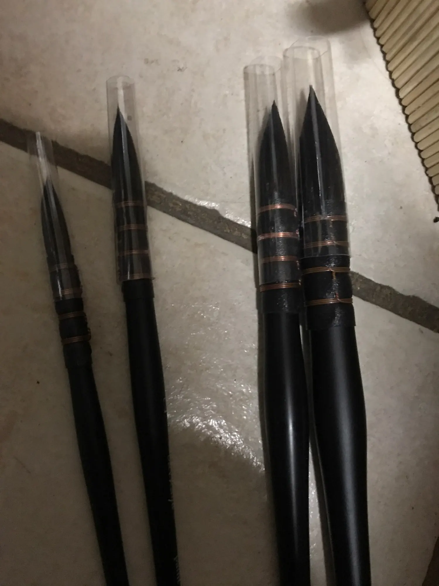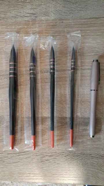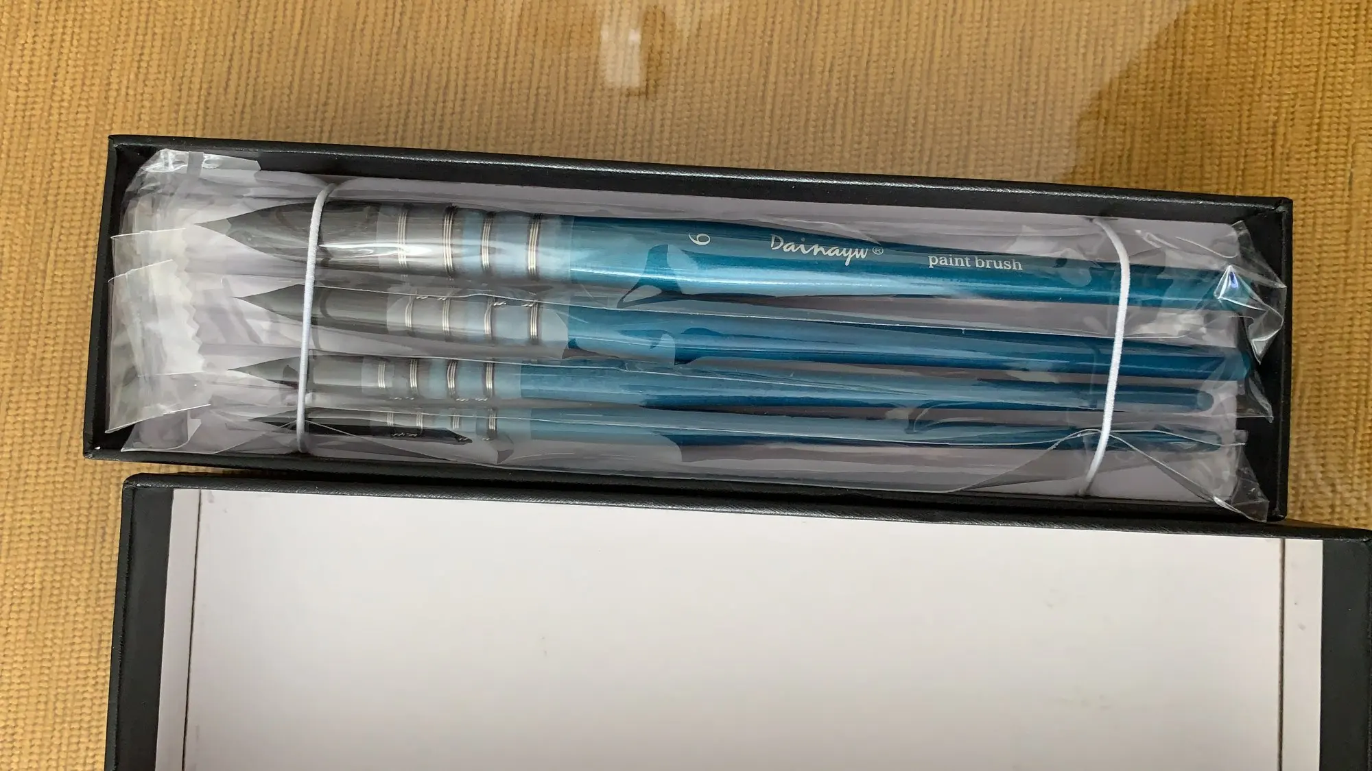 Прибыло менее чем за месяц. Кисти в коробке, как на фотографиях магазина. Также каждая кисть упаковывается индивидуально с собственной крышкой. Держатель-пластик, но я не против, так как волосы хорошего качества, кончик острый, мягкий, хорошо держит воду. Рекомендуется.