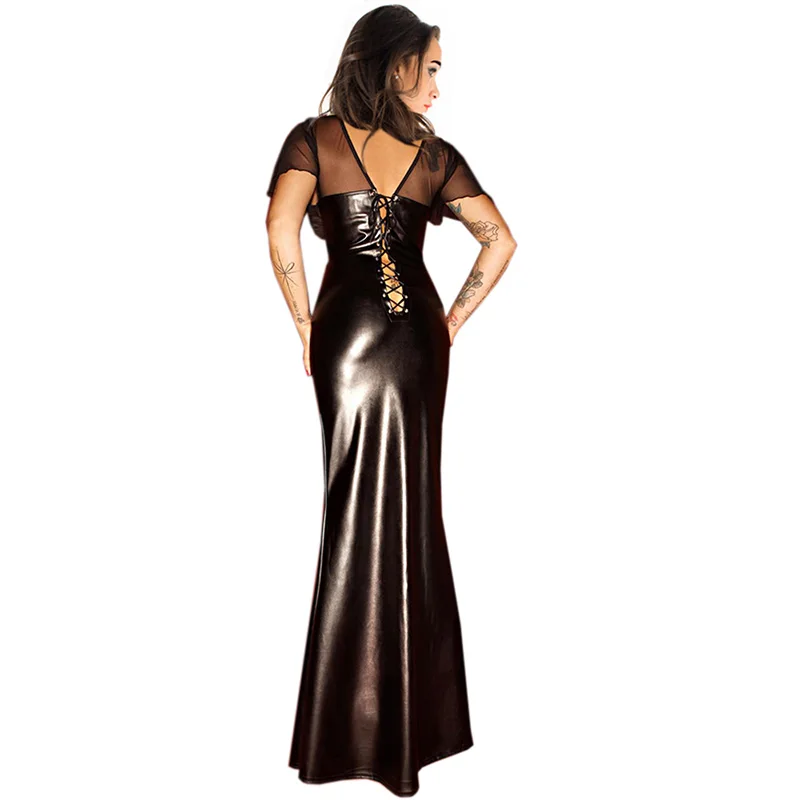 Сексуальное черное виниловое платье с V-образным вырезом и открытой спиной, женское кожаное Клубное платье с разрезом, прозрачное длинное платье для ночного клуба