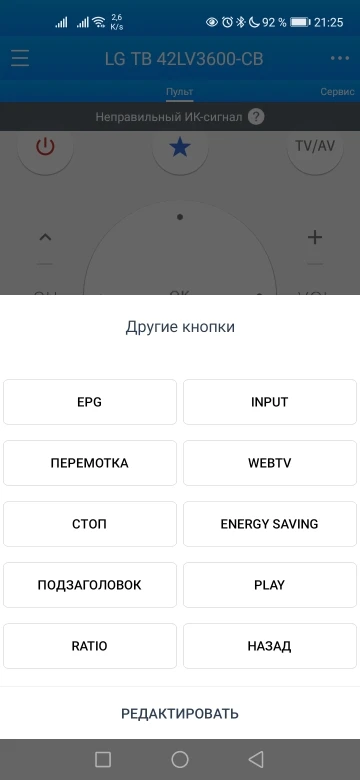 ик-команды к телевизору JVC приложение не смогло подобрать, через функцию обучения родным тв-пультом всё сработало