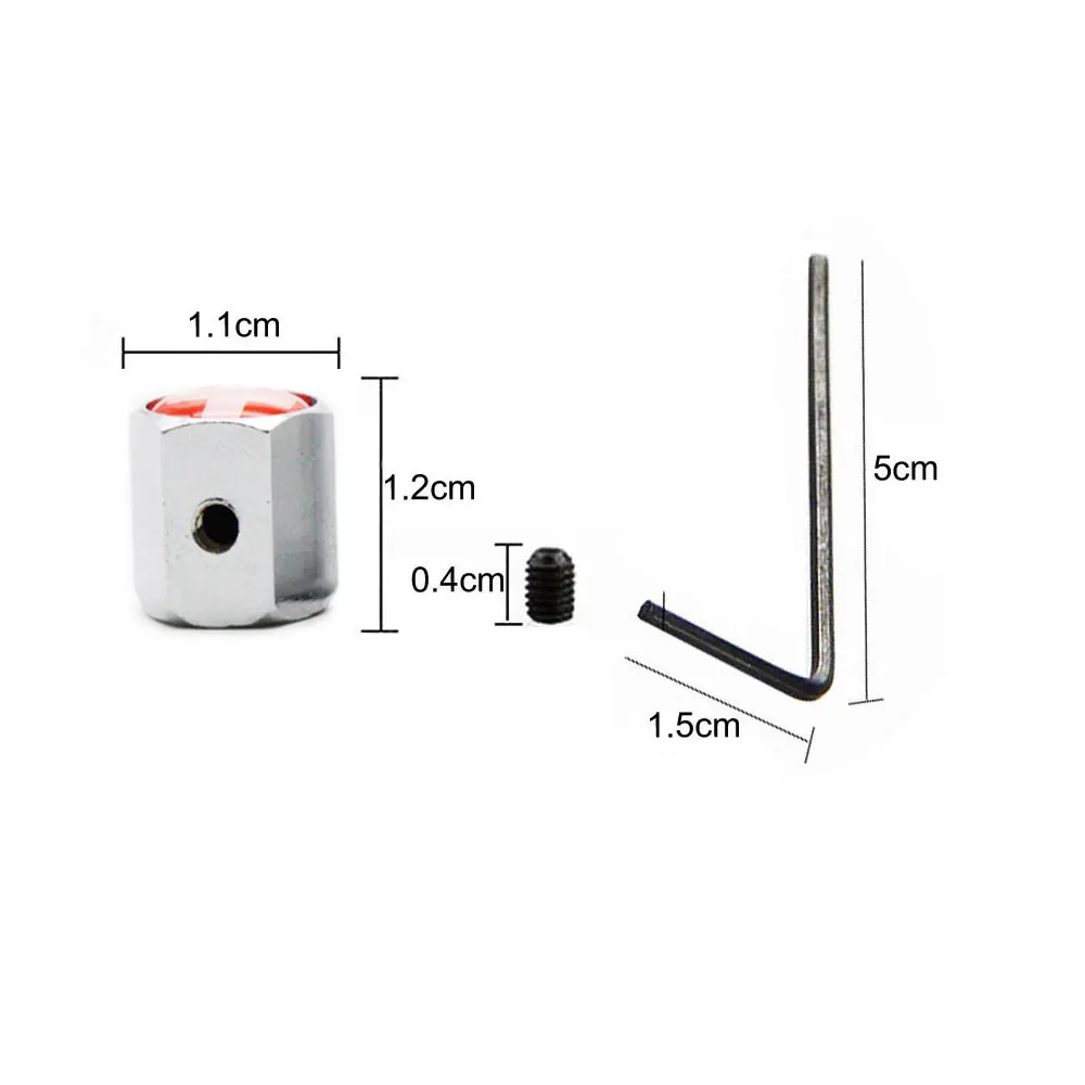 5. Пакет включает в себя: 5 шт./компл. (4 шт. колпачки, 1 гаечный ключ 4 анти-кражи винты); Размеры: 4,8*1,5 см/1,8*0,59 дюймов (мини); Вес: 26 г; Цвет: черный/серебристый (цинковый сплав)