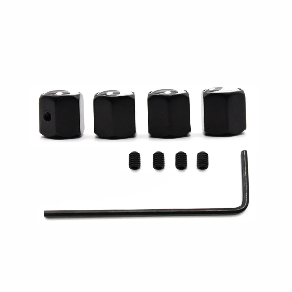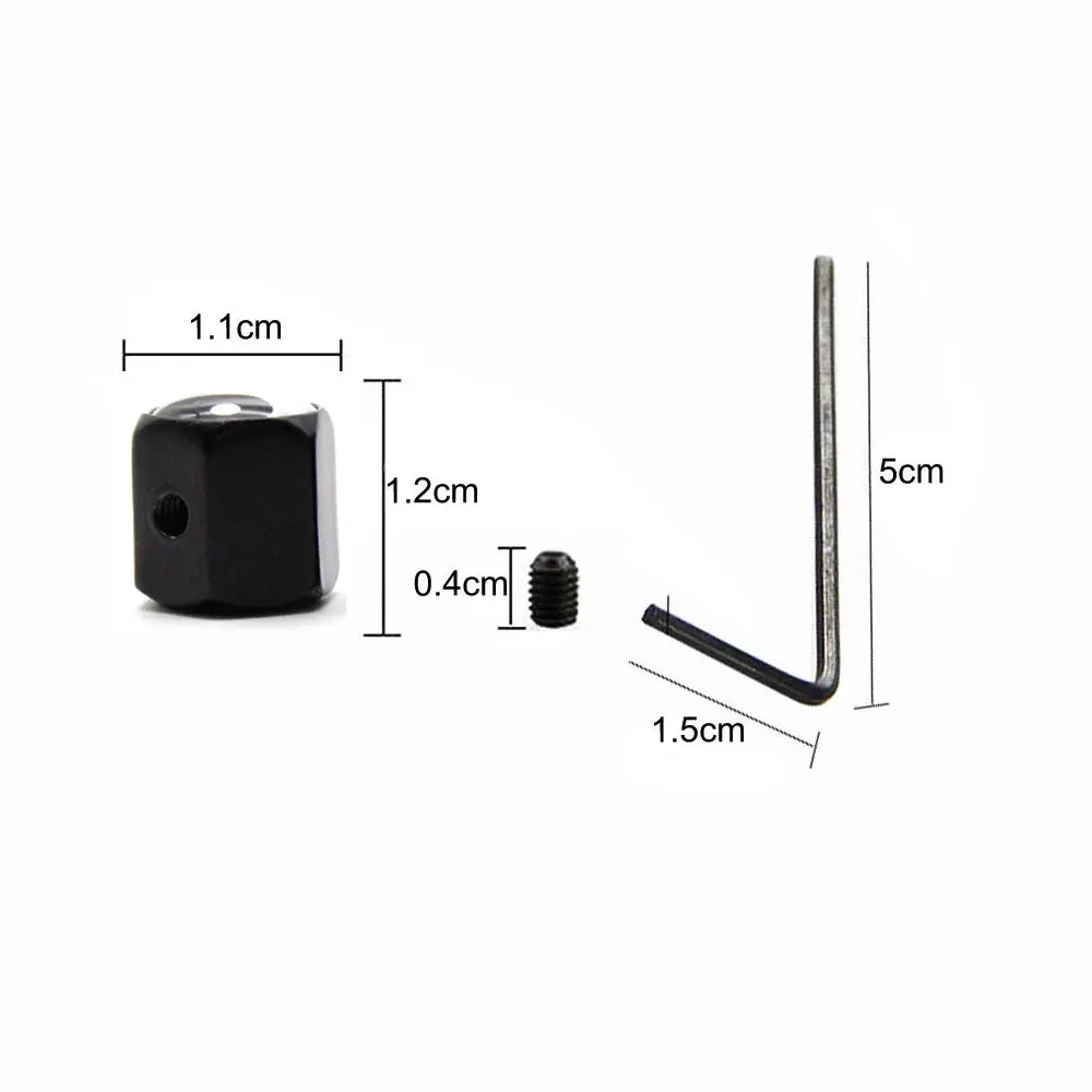5. Пакет включает в себя: 5 шт./компл. (4 шт. колпачки, 1 гаечный ключ 4 анти-кражи винты); Размеры: 4,8*1,5 см/1,8*0,59 дюймов (мини); Вес: 26 г; Цвет: черный/серебристый (цинковый сплав)