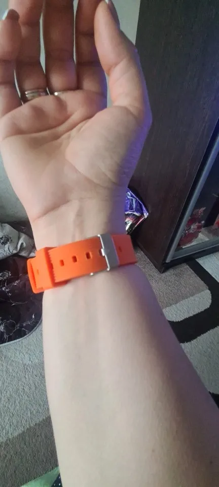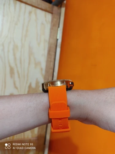 Ремешок хороший, но не ожидала,что будет такой толстый и плотный. По сравнению с оригинальным толщина в 1,5 раза больше +длинный свободный край. Но в целом подошел и смотрится нормально, единственное толщина смущает