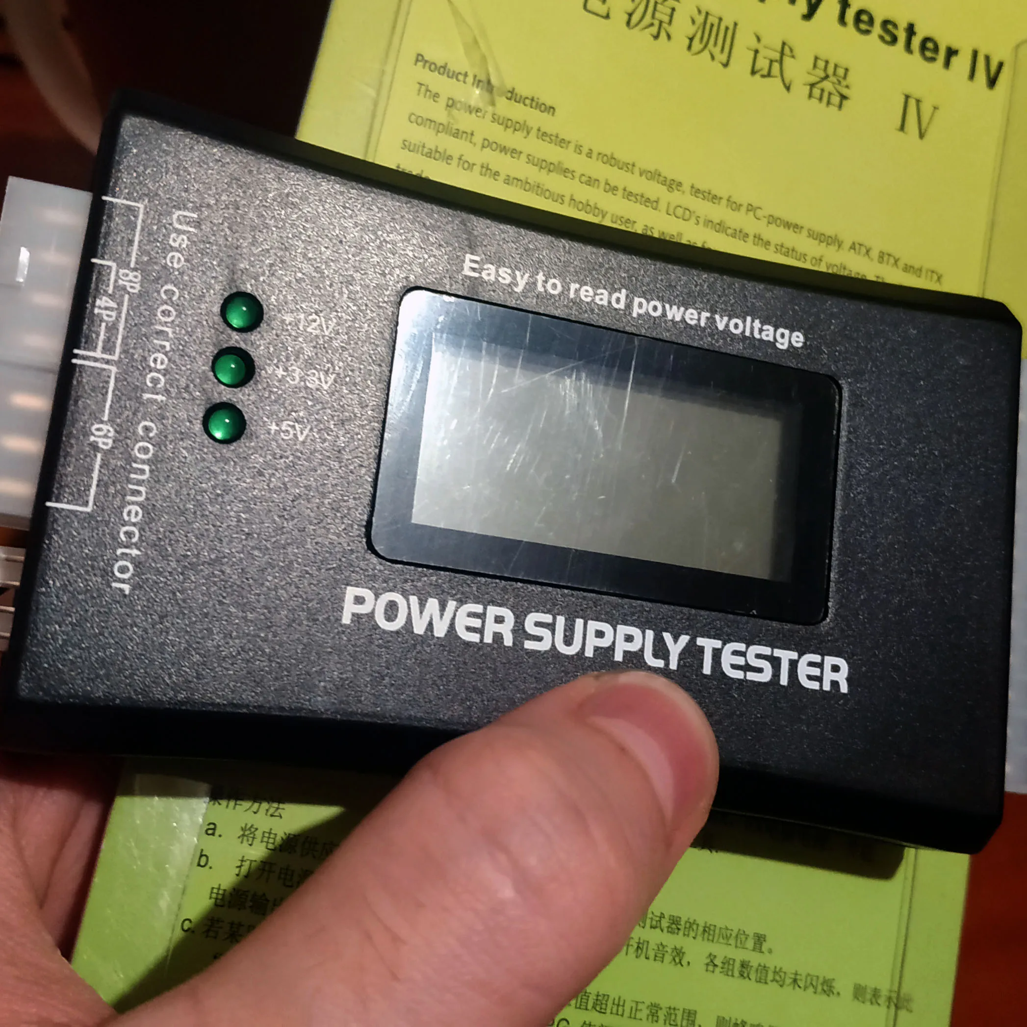 Тестер работает, пищит, если чего-то из питаний не хватает. Хотел купить именно с экраном (а не просто набор светодиодов), посему доволен. Покупался чисто для себя и ожиданий слишком уж больших - не имел. Из минусов - зажали пупырку, приехало в обычном пакете. На экране не было защитной плёнки от чего там сейчас царапины. Ну и молекс не очень себя чувствует, хотя проверять проверяет. До Днепра за 2 недели, нужен недорогой тестер - берите этот.