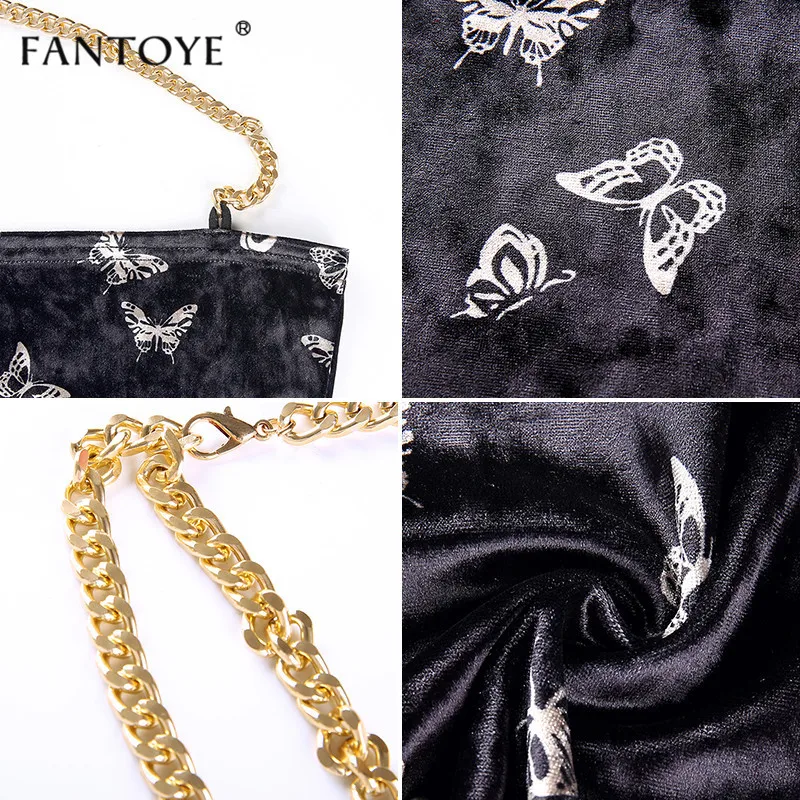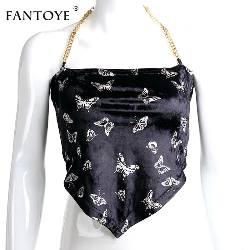 Женский бархатный топ Fantoye, укороченный топ с открытой спиной, с принтом бабочки, на бретелях, с металлической цепочкой, асимметричный, уличный, черный