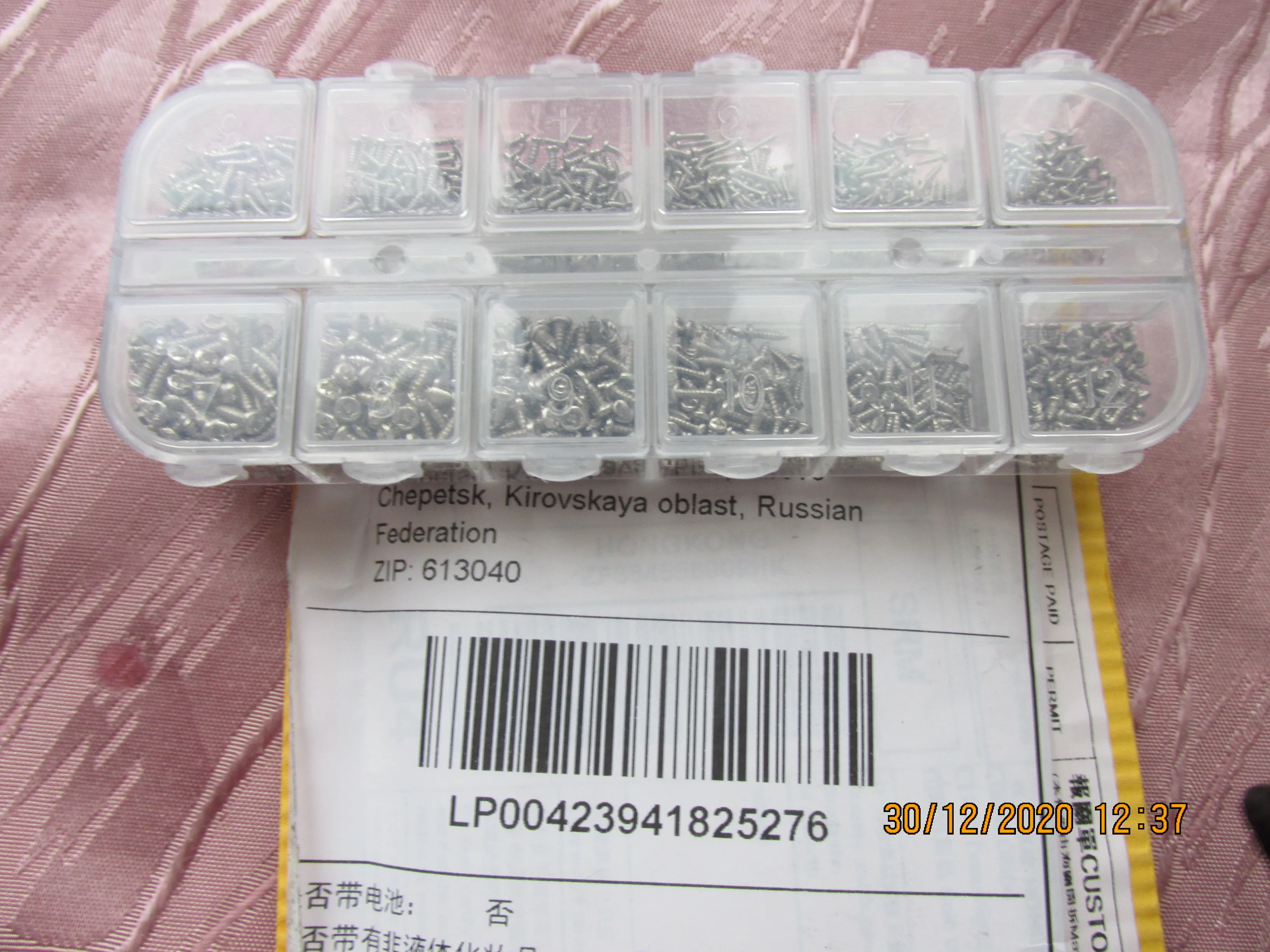 Хороший комплект. Постоянно не хватает таких маленьких шурупчиков, а в продаже в моем городе их найти трудно. Теперь хватит на долго. Доставили быстро, примерно за 3 недели в составе большой посылки с заказами с 11.11. С продавцом не общался так как не было необходимости.