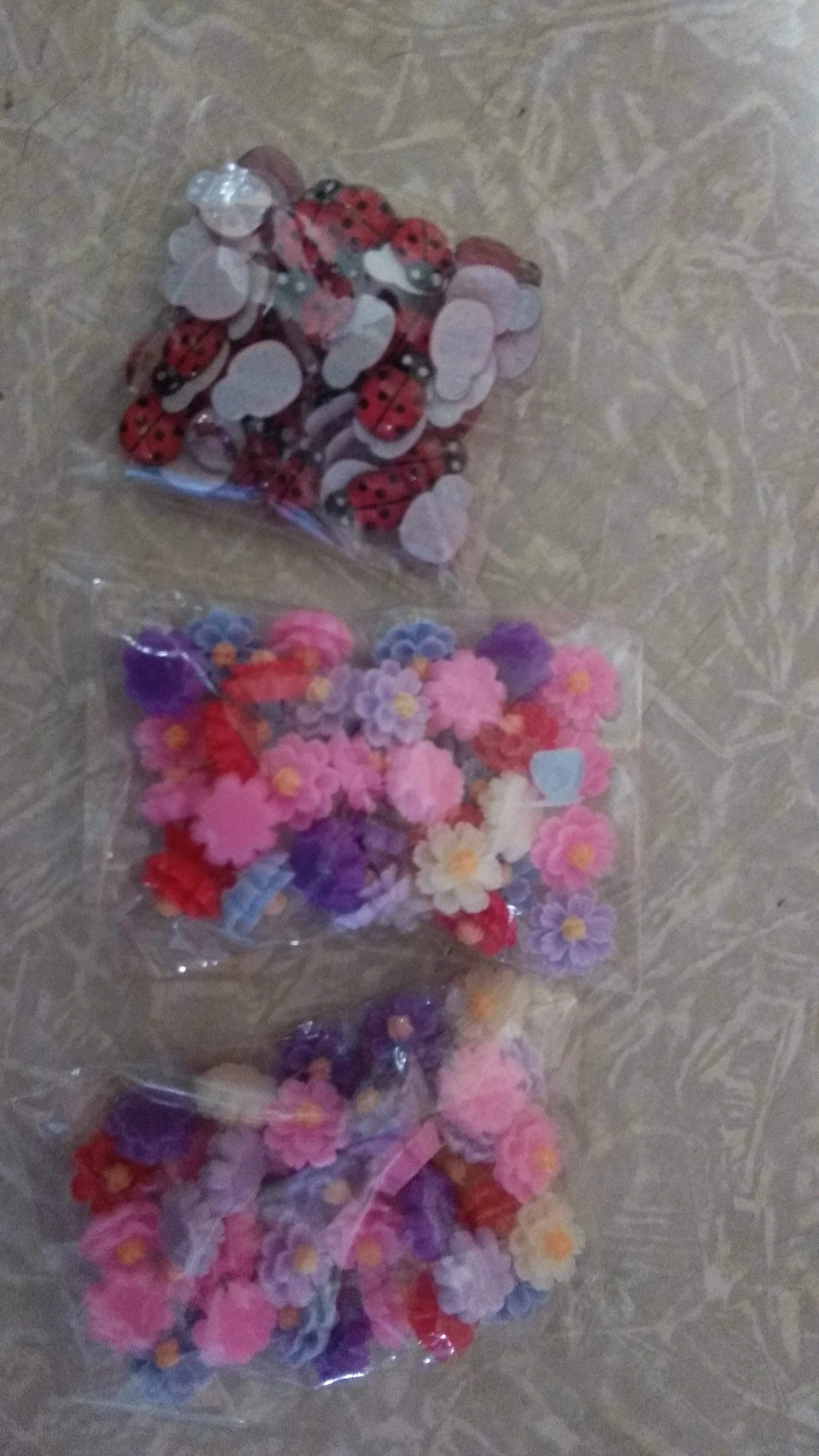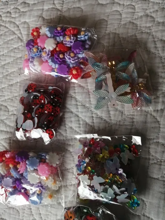 миленькие, маленькие цветочки. и мне, и ребенку понравились. будем украшать поделки, заколки, резинки, ободки. яркие, все целые