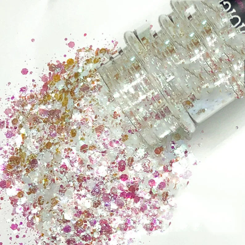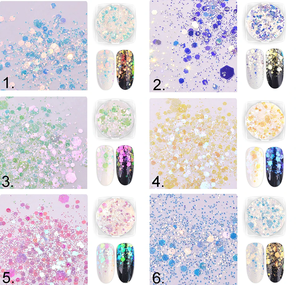 Все наши смеси-это сочетание 3 мм, 2 мм, 1 мм и пылевых хлопьев, с сочетанием голографических, переливающихся и металлических частиц