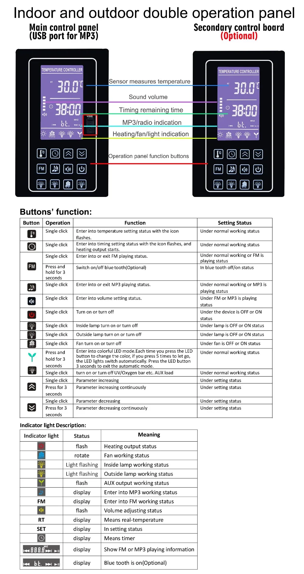 Многофункциональные функции: тепловой, mp3, FM, внутренний и внешний светильник, светодиодный цветной Терапевтический щит, вентилятор, AUX (УФ/кислородный бар и т. д.)
