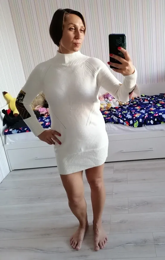 Длинный свитер, но не такой, как платье, мягкий, не царапается, размер XL соответствует 38.