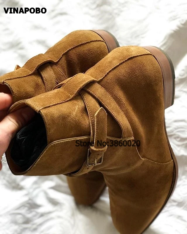 Новинка; Модные ковбойские мужские Ботинки коричневого цвета из натуральной замши; Ботильоны с острым носком и пряжкой; Мужские ботинки челси; Сезон осень-зима