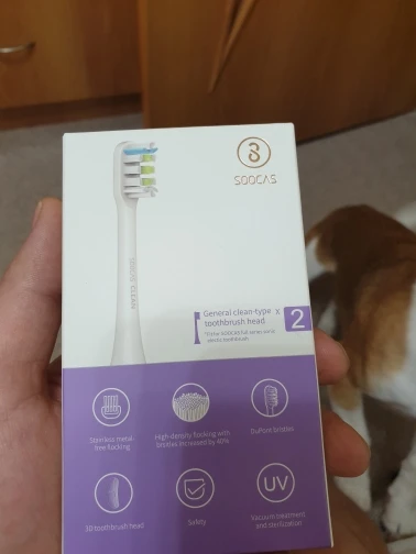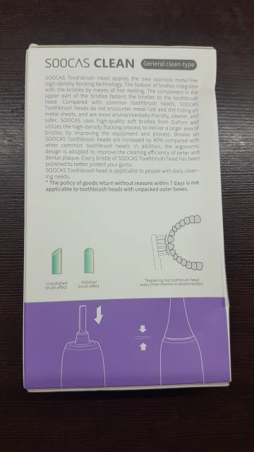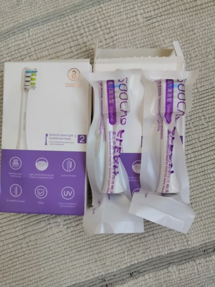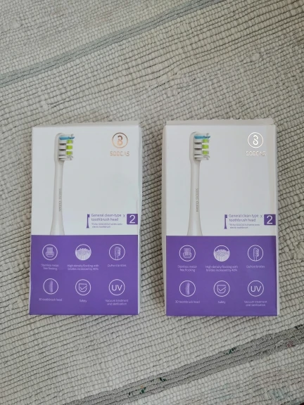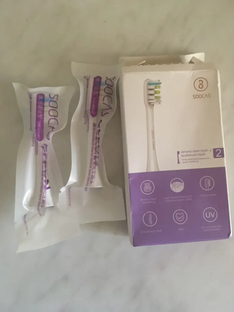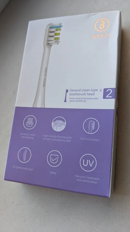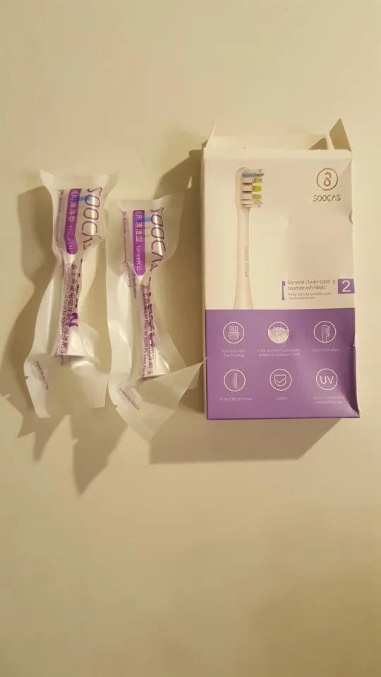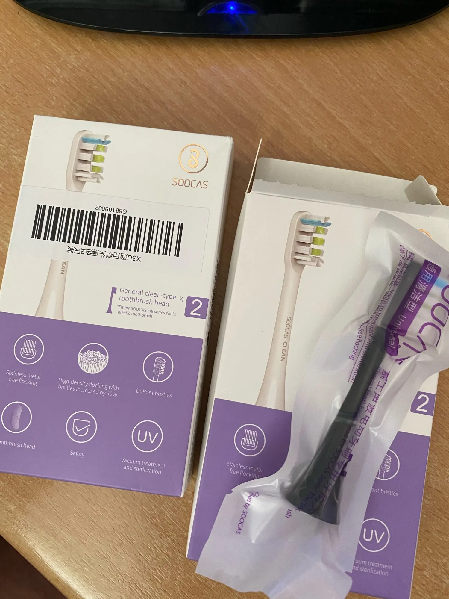 Хорошие насадки. Упакованы в вакуум, есть защитный колпачок, пришли в мятой коробке но внутри все целое. Похоже на оригинал, внутри насадка как у оригинала фиолетовая. Щетина мягкая. На фото справа оригинальная насадка от Soocas x3, слева та что пришла.