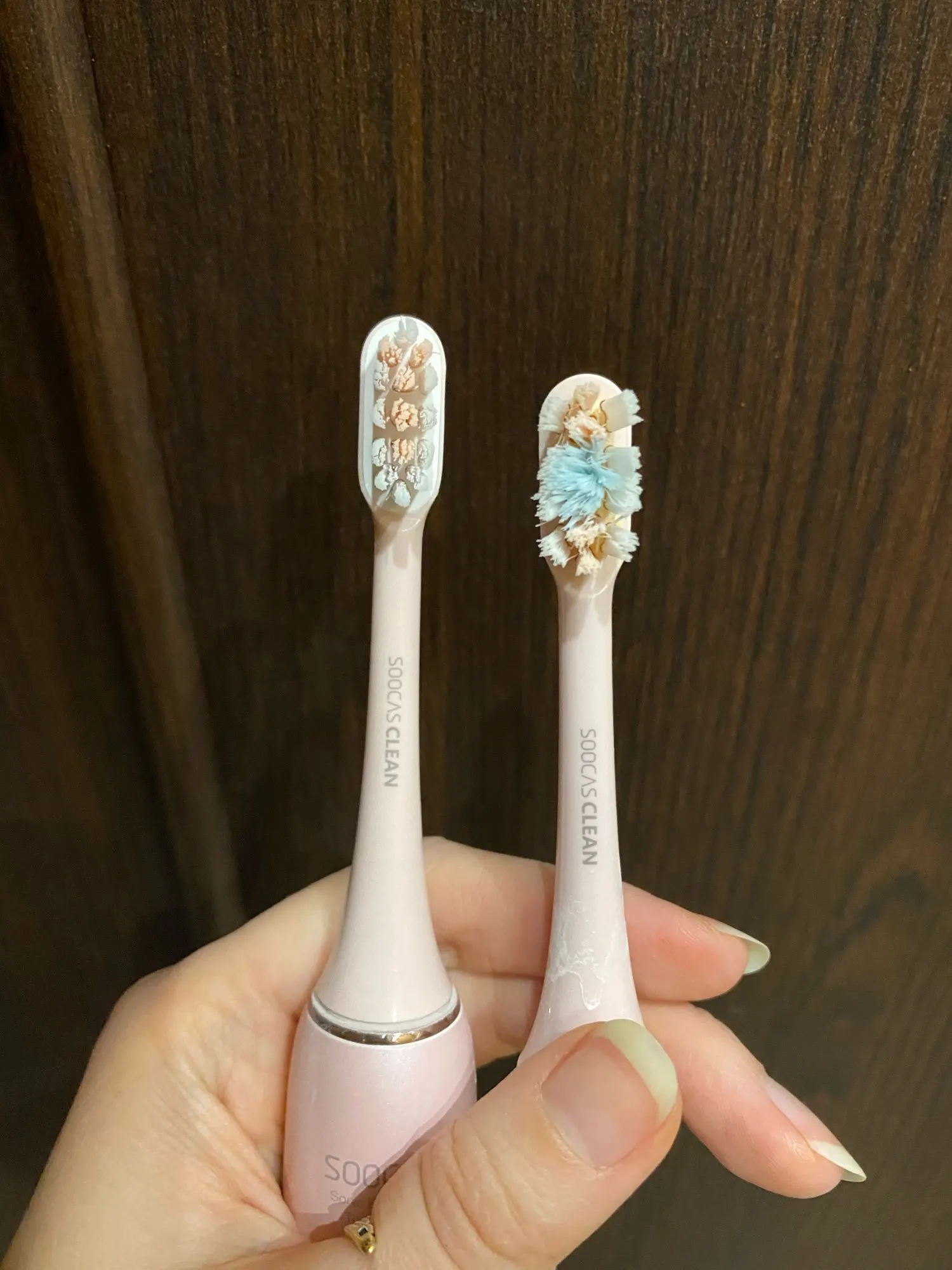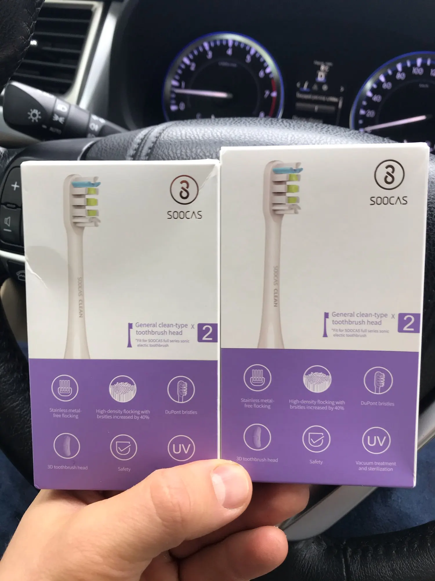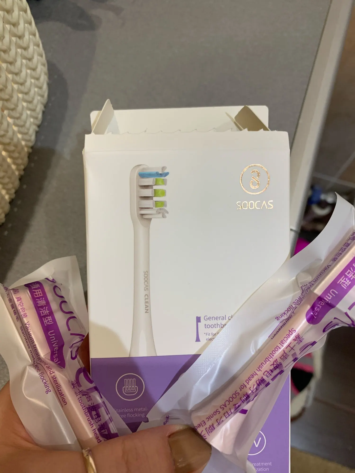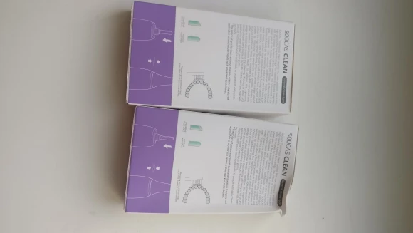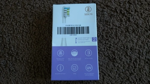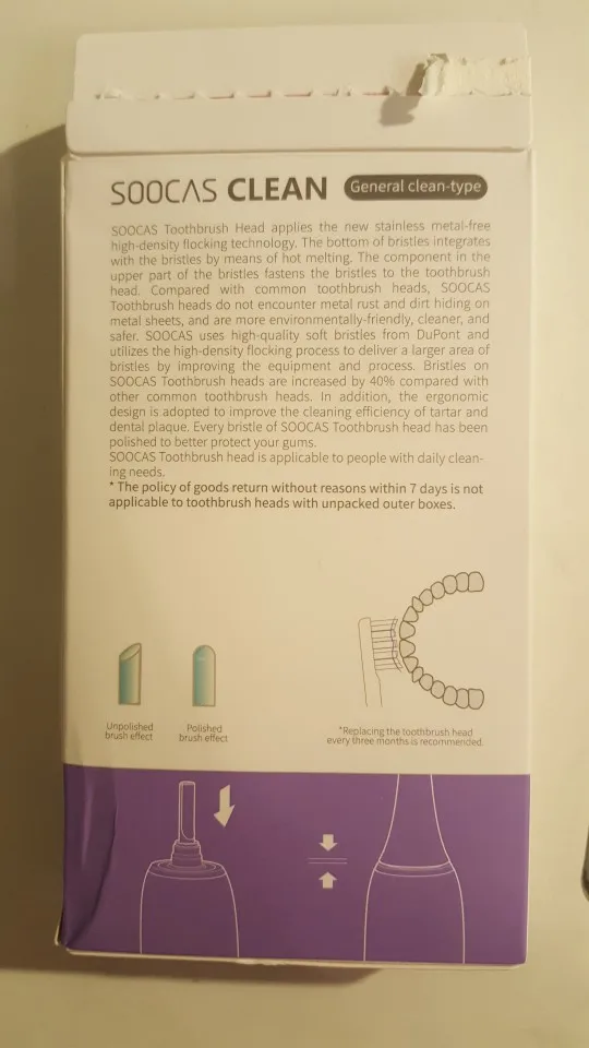 Хорошие насадки. Упакованы в вакуум, есть защитный колпачок, пришли в мятой коробке но внутри все целое. Похоже на оригинал, внутри насадка как у оригинала фиолетовая. Щетина мягкая. На фото справа оригинальная насадка от Soocas x3, слева та что пришла.