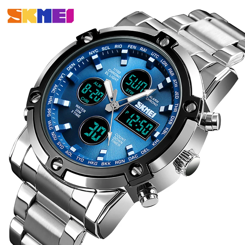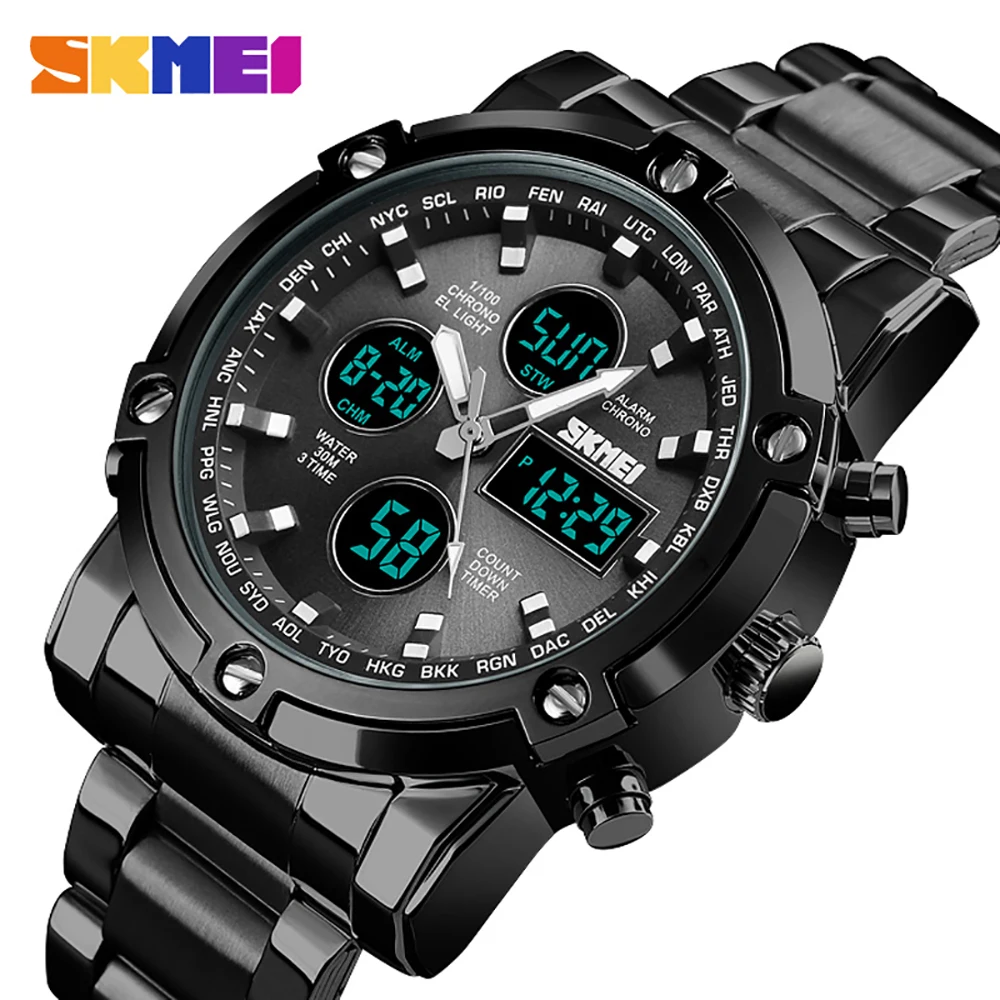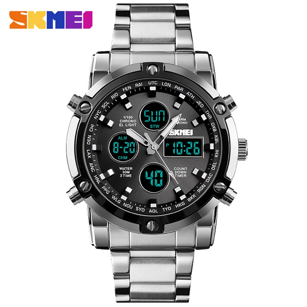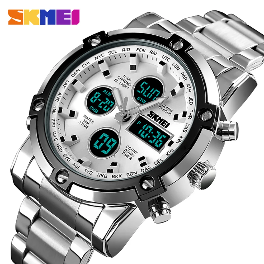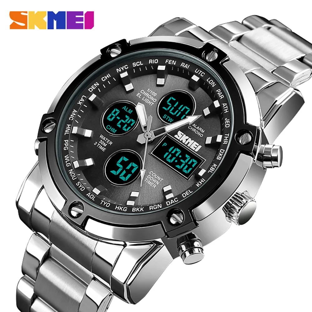 SKMEI Роскошные Мужские кварцевые аналоговые часы, спортивные цифровые часы, мужские наручные часы, водонепроницаемые часы из нержавеющей стали, мужские часы