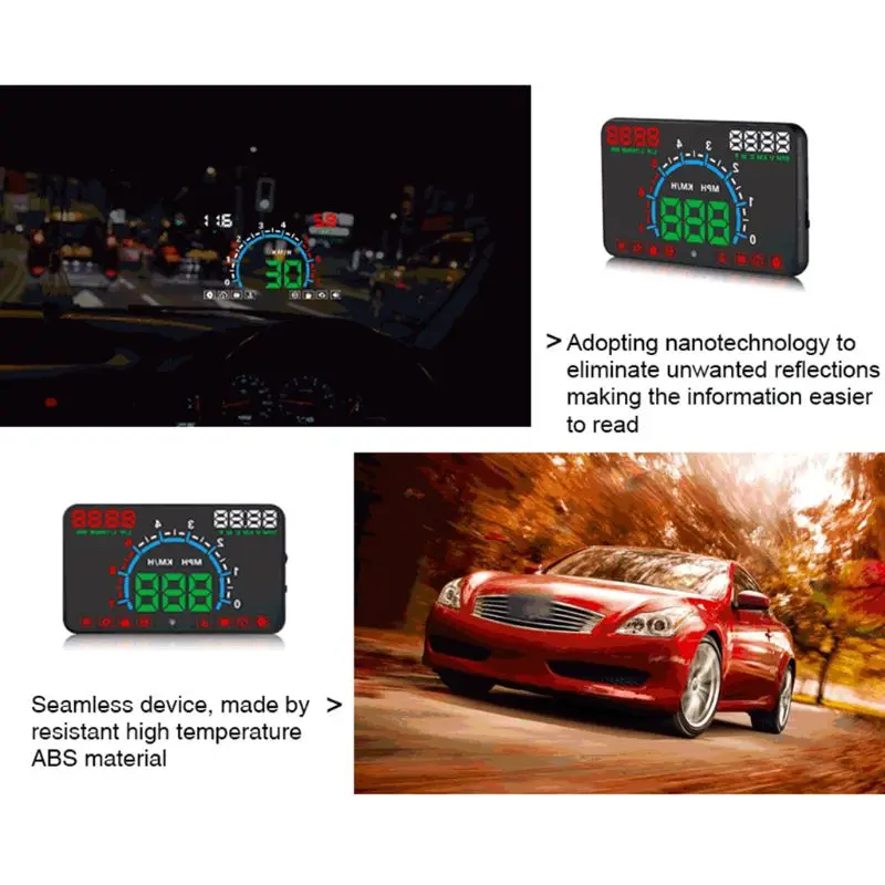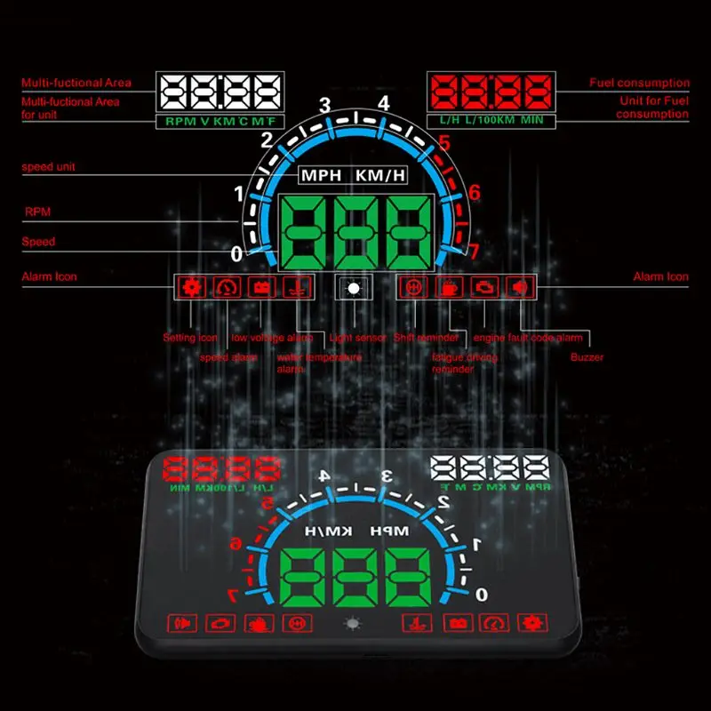 HUD короткий для отображения головы вверх. Он отображает данные вождения на лобовом стекле, такие как скорость, об/мин, расход топлива, температура воды, напряжение; Избегая водителей стать опасными из-за наблюдения за прибором во время вождения.