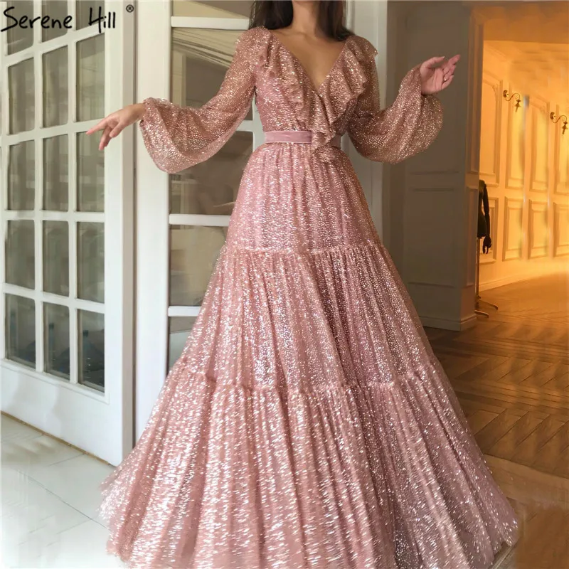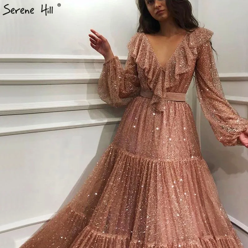 Дубай Дизайнер розовое золото v-образным вырезом Вечерние платья 2021 Новые Длинные рукава Роскошные Блестящие модные вечерние платья LA6671